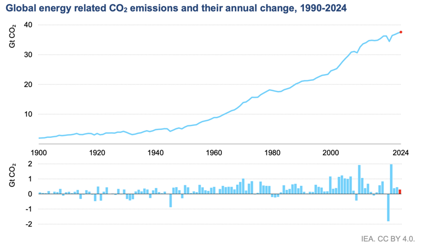 全球能源相关碳排放形势严峻,电气化水平提升、极端天气、数据中心扩张等因素驱动电力需求快速增长。根据国际能源署(IEA)的数据,2024年与能源相关的二氧化碳排放总量同比增长0.8%,增速较2023年有所下降,但排放总量仍达到378亿吨的历史最高水平,导致大气二氧化碳浓度达到创纪录的422.5ppm,同比增长约3ppm。碳排放增长主要源自燃料燃烧,2024年燃料燃烧产生的二氧化碳排放量增长约1%,总量为3.57亿吨;而工业过程产生的二氧化碳排放量下降2.3%。碳排放增长的背后反映的是全球能源需求,尤其是电力需求持续增长。2024年全球能源需求同比增长2.2%,其中电力需求的增速为4.3%,高于能源总需求和GDP的增速,驱动力主要为向电力密集型制造业的转变、终端用户的电气化程度不断提高、极端天气下的降温需求,以及数据中心和人工智能等对电力需求的增长。综合来看,在巴黎协定设定的气候目标下,实现经济发展下能源需求增长与碳排放下降脱钩仍道阻且长。
