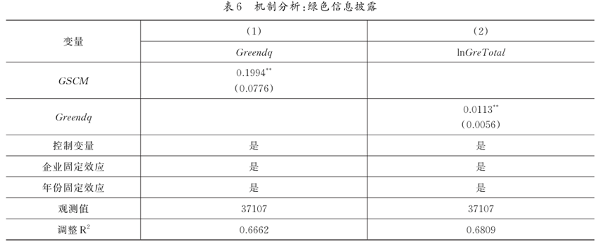 1.绿色信息披露:GSCM显著提高信息披露水平(Greendq),进而促进绿色创新(表6)。