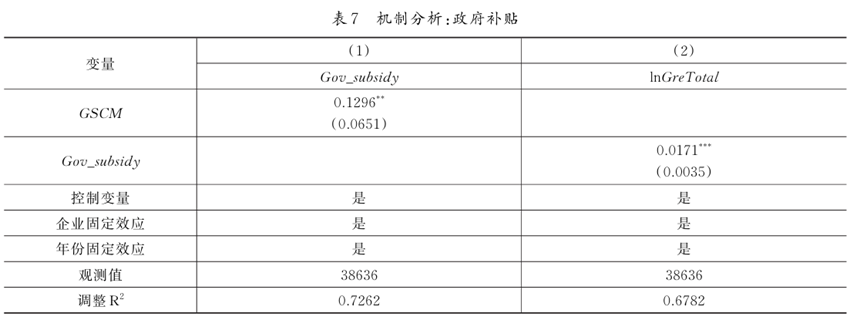 2.政府补贴:GSCM显著增加政府补贴(Gov_subsidy),进而推动绿色创新(表7)。