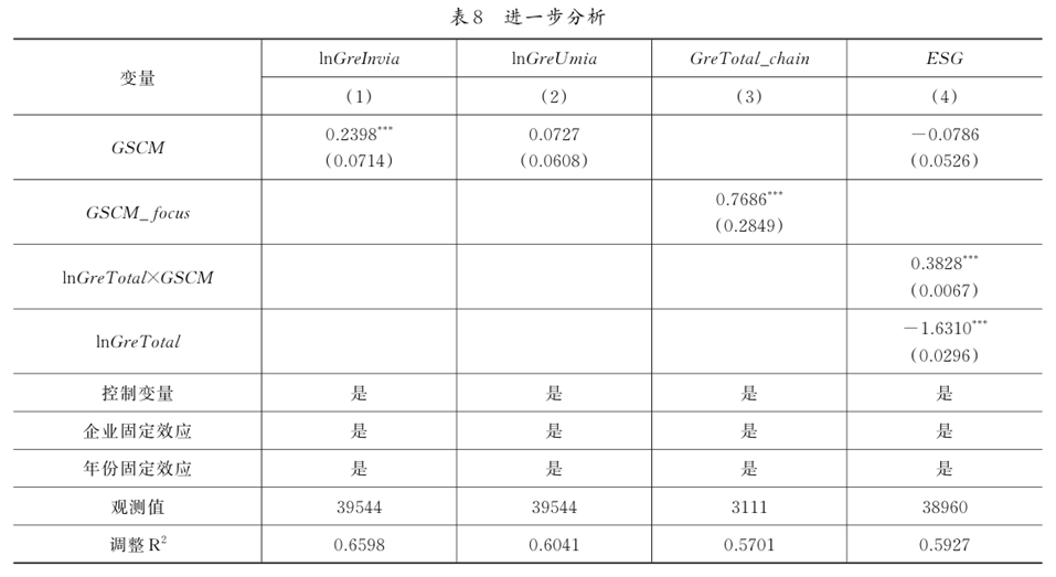回归结果表明,GSCM驱动的绿色创新显著提升企业ESG评级,增强可持续发展能力(表8)。