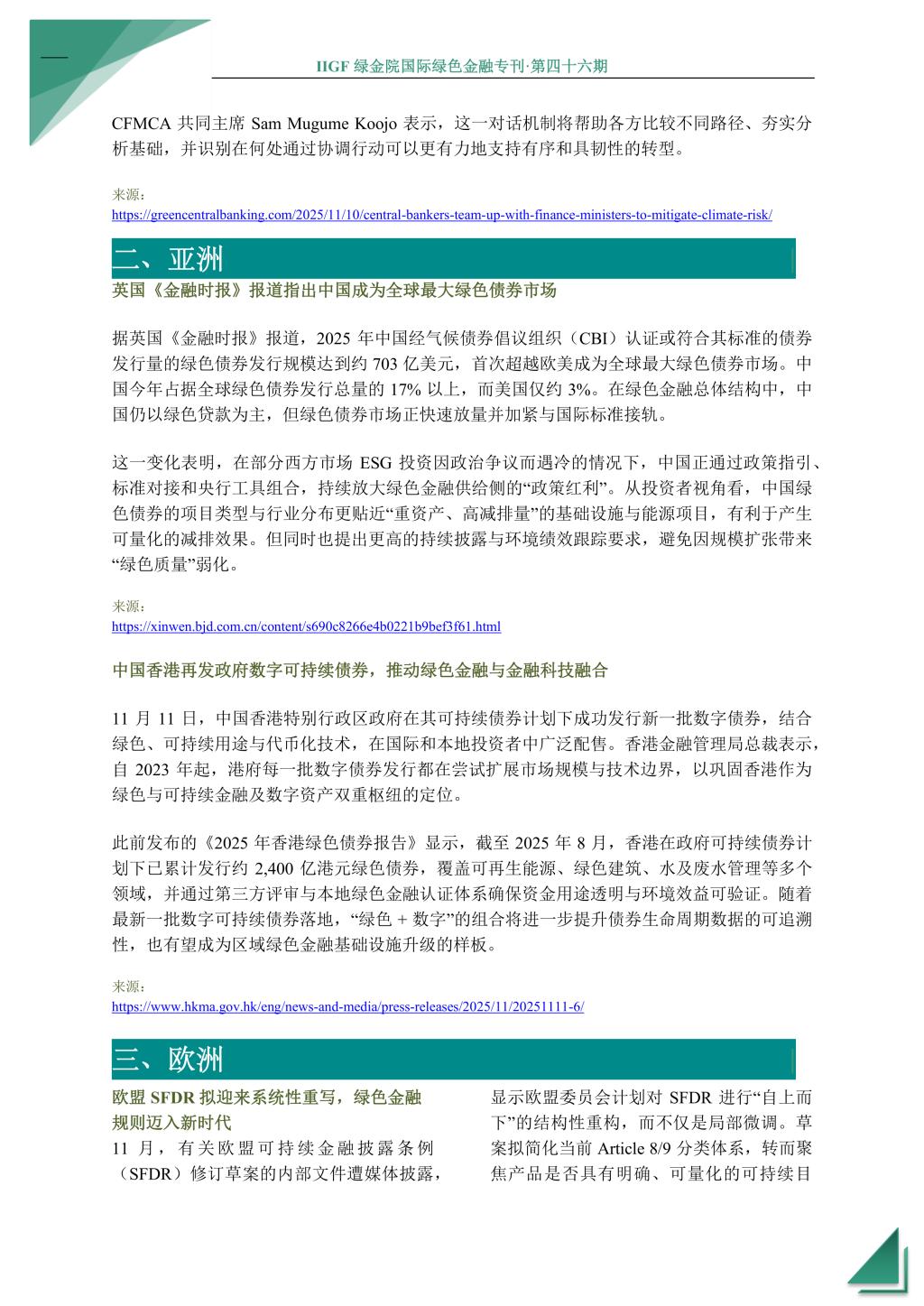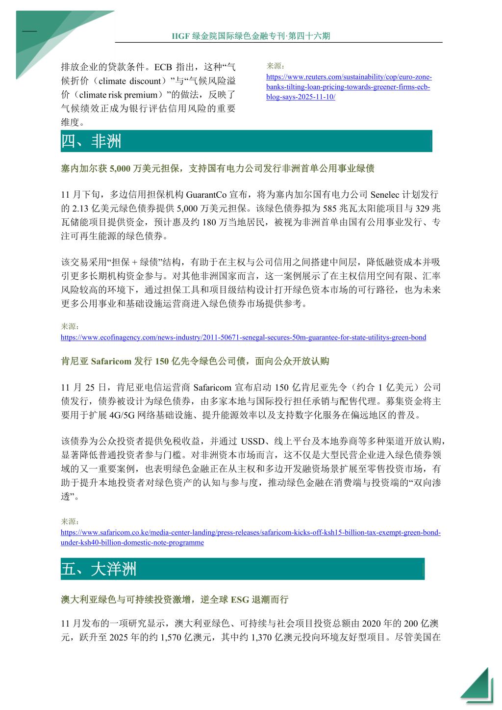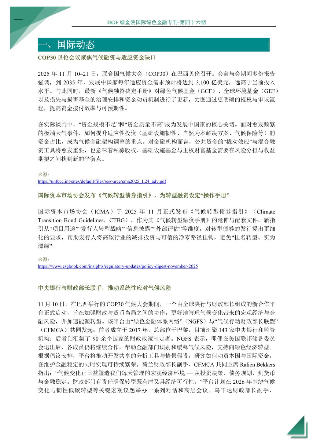本期国际绿色金融专刊将为您介绍2025年11月全球绿色金融领域的最新发展和动态。COP30会议聚焦气候融资与适应资金缺口,国际资本市场协会发布《气候转型债券指引》,NGFS与CFMCA组成合作平台以推动系统性应对气候风险。在亚洲,英国《金融时报》报道指出中国成为全球最大绿色债券市场,中国香港再发政府数字可持续债券;在欧洲,欧盟 SFDR 拟迎来系统性重写,欧盟可持续金融结构出现显著分化,欧盟多国推动纺织行业扩展生产者责任,欧元区银行将贷款条件向绿色企业倾斜;在非洲,塞内加尔获 5000 万美元担保支持国有电力公司发行非洲首单公用事业绿债,肯尼亚Safaricom发行 150 亿先令绿色公司债;在大洋洲,澳大利亚绿色与可持续投资激增。