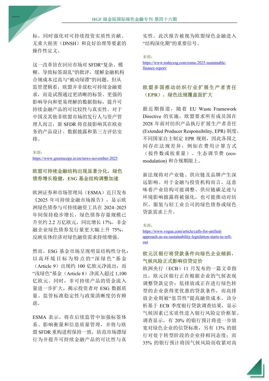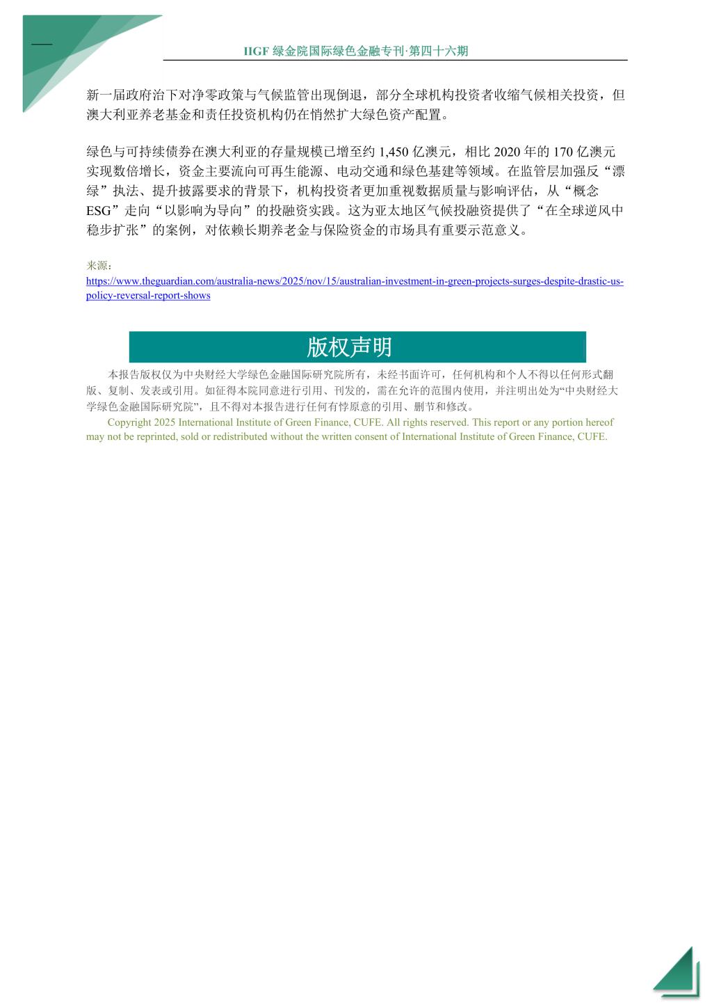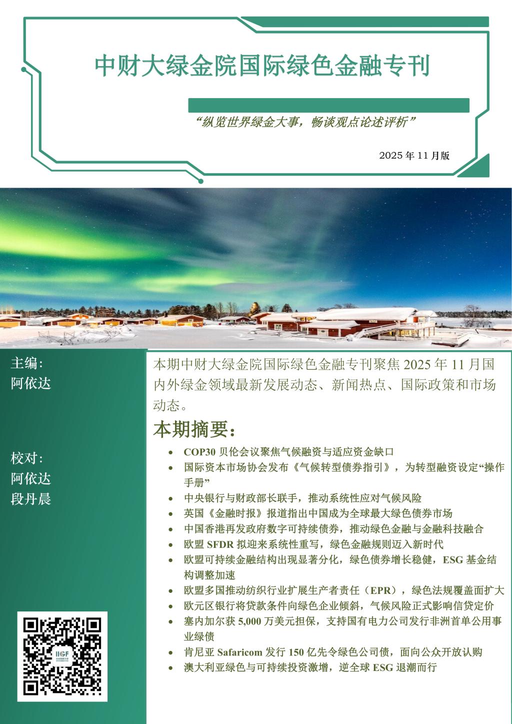 本期国际绿色金融专刊将为您介绍2025年11月全球绿色金融领域的最新发展和动态。COP30会议聚焦气候融资与适应资金缺口,国际资本市场协会发布《气候转型债券指引》,NGFS与CFMCA组成合作平台以推动系统性应对气候风险。在亚洲,英国《金融时报》报道指出中国成为全球最大绿色债券市场,中国香港再发政府数字可持续债券;在欧洲,欧盟 SFDR 拟迎来系统性重写,欧盟可持续金融结构出现显著分化,欧盟多国推动纺织行业扩展生产者责任,欧元区银行将贷款条件向绿色企业倾斜;在非洲,塞内加尔获 5000 万美元担保支持国有电力公司发行非洲首单公用事业绿债,肯尼亚Safaricom发行 150 亿先令绿色公司债;在大洋洲,澳大利亚绿色与可持续投资激增。