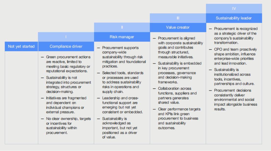 三是战略商业案例(Strategic business case),重点内容包括商业案例开发与框架构建、治理与投资决策。即,价值框架构建,是否建立融合环境效益(如碳减排)、财务影响(TCO、风险成本)和战略收益(品牌、合规)的综合评估模型;内部碳定价应用,是否使用内部碳价量化绿色选项的长期价值,并用于投资决策;跨部门联合开发机制,绿色采购是否与财务、可持续发展、产品等部门共同开发和构建商业案例;溢价接受机制,是否有明确政策允许为高环境绩效产品/服务支付合理溢价、审批路径是否清晰等。