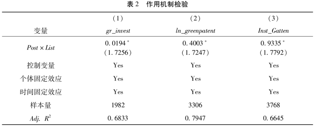 基于前文理论分析,基于内外部视角,绿色金融改革创新试验区政策能够通过提高绿色研发与投资和提升机构投资者绿色关注两个渠道影响企业“脱虚向实”,本部分对这两个机制分别进行检验。
