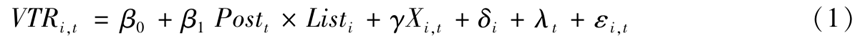 核心解释变量为绿色金融改革创新试验区政策实施的交互项:List为区分实验组和控制组的虚拟变量;Post为政策实施前后时间虚拟变量。具体来说,在地级市层面构建了变量List,若企业i的注册地处于绿色金融改革创新试验区则取值为1,否则为0;构建时间虚拟变量Post,以各绿色金融改革创新试验区的获批年份为基准,将获批当年及之前年度赋值为0,获批后的第二年起赋值为1。X_(i,t)为一系列控制变量,δ_i为企业个体固定效应,λ_t为时间固定效应,ε_(i,t)为随机扰动项。控制变量包括公司层面控制变量(企业资产规模、资产负债率、成长能力、总资产净利润率、自由现金流、上市年限以及管理层持股比例)和城市层面控制变量(经济发展水平、财政缺口、财政支出规模、财政自主权等)。(注:浙江省湖州市、衢州市,江西省赣江新区,广东省广州市,贵州省贵安新区,新疆哈密、昌吉州和克拉玛依市绿金试验区于2017年6月14日获批;甘肃省兰州新区和重庆市绿金试验区分别于2019年11月28日和2022年8月19日获批。)