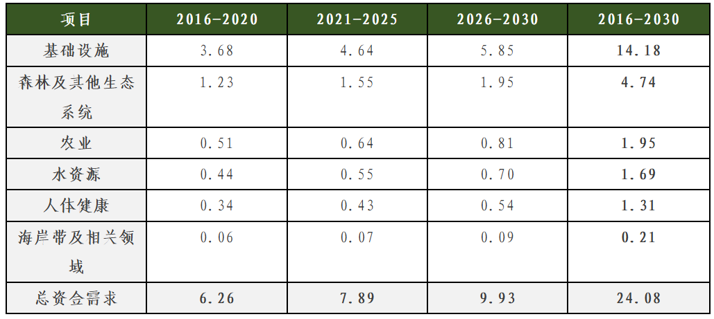 根据2018年12月由中国政府向《联合国气候变化框架公约》秘书处提交的《中华人民共和国气候变化第三次国家信息通报》,在2016—2030年间,中国实现国家自主贡献适应目标的资金需求约为24万亿元,年均约为1.6万亿元。其中,主要资金需求来源于基础设施建设,占比58.9%,约半成为交通基础设施和能源基础设施的适应气候变化资金需求;森林和其他生态系统、农业、水资源、人体健康分别占比19.68%、8.1%、7.0%、5.4%,此外还有海岸带和相关海域的适应资金需求。