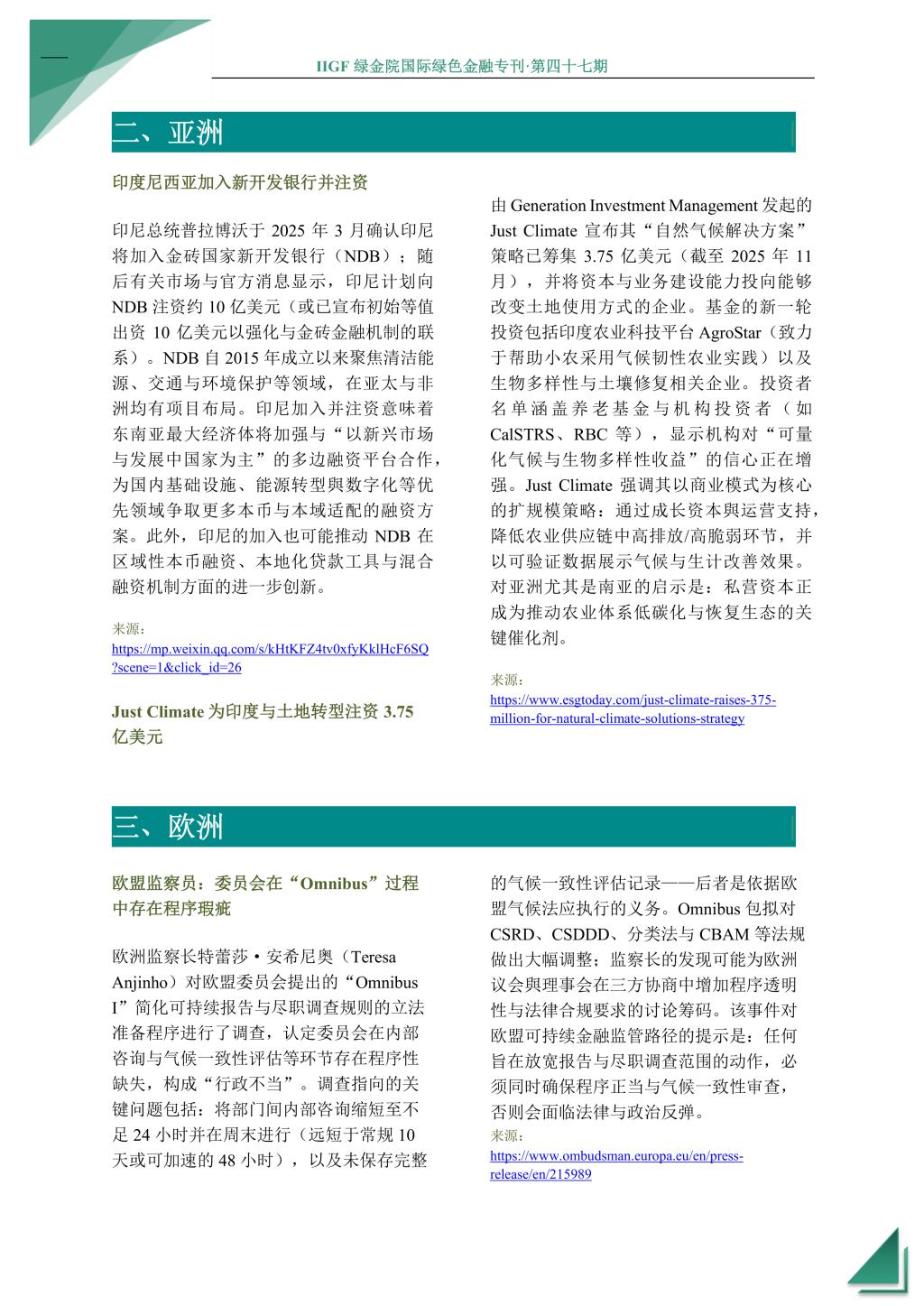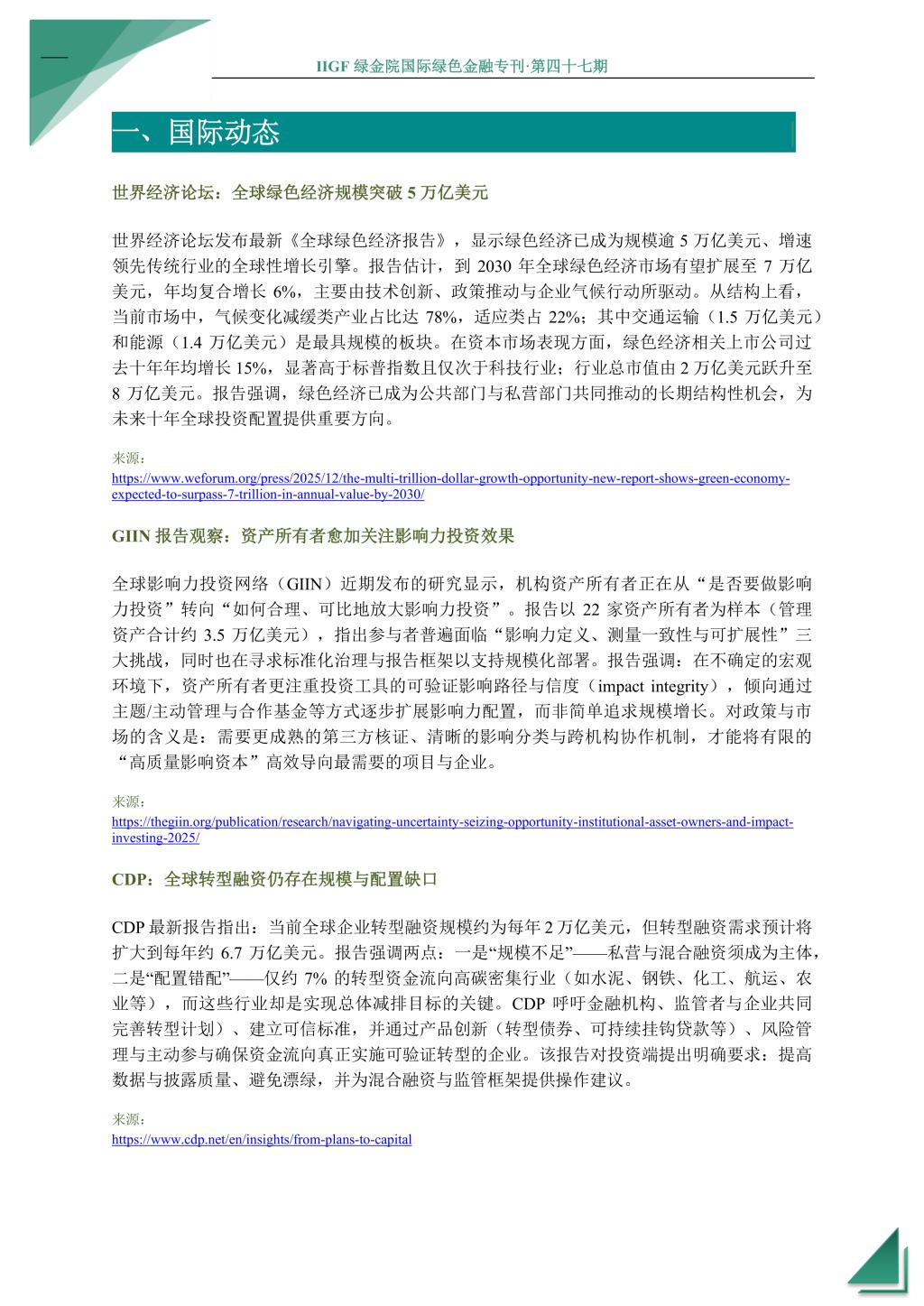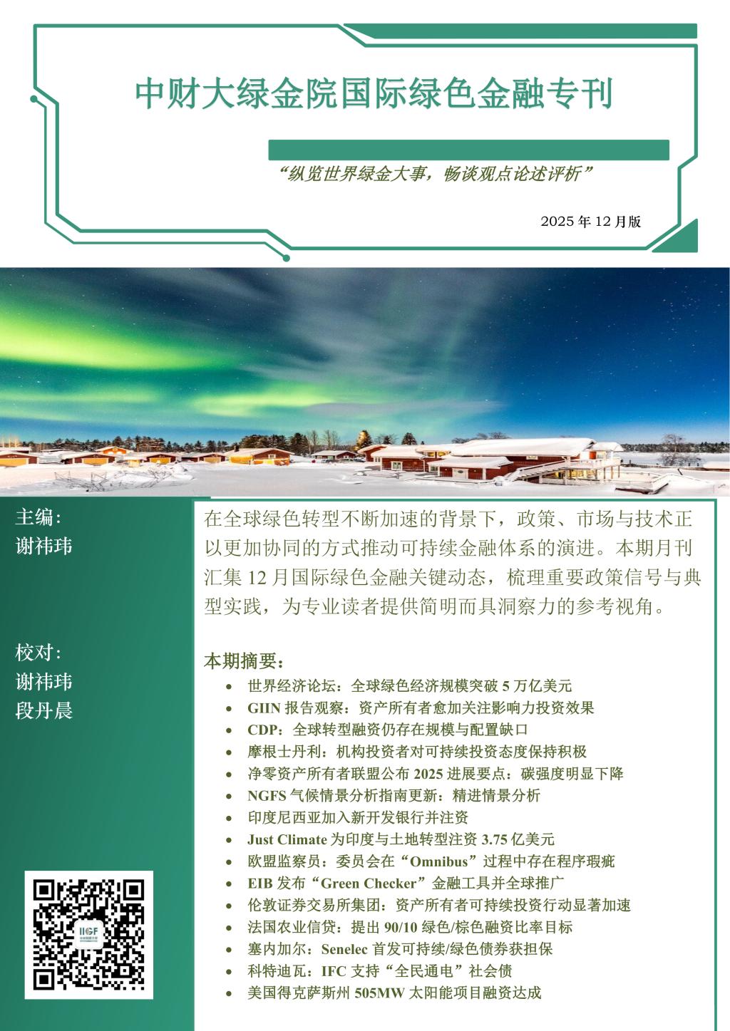本期国际绿色金融专刊将为您介绍2025年12月全球绿色金融领域的最新发展和动态。世界经济论坛报告显示,全球影响力投资网络研究指出资产所有者愈加关注影响力投资效果,CDP称全球转型融资仍存在规模与配置缺口,摩根士丹利调查显示机构投资者对可持续投资态度保持积极,NGFS气候情景分析指南更新。在亚洲,印度尼西亚加入新开发银行并注资,Just Climate为印度与土地转型注资3.75亿美元;在欧洲,欧盟监察员称欧盟委员会在“Omnibus”过程中存在程序瑕疵,EIB 发布“Green Checker”金融工具,伦敦证券交易所集团研究显示资产所有者可持续投资行动显著加速,法国农业信贷提出 90/10 绿色/棕色融资比率目标;在非洲,塞内加尔国有电力公司Senelec首发可持续/绿色债券获担保,IFC支持科特迪瓦“全民通电”社会债;在北美洲,美国得克萨斯州 505MW 太阳能项目融资达成。