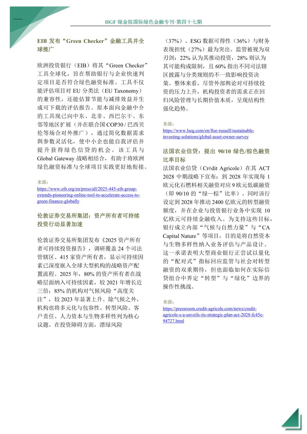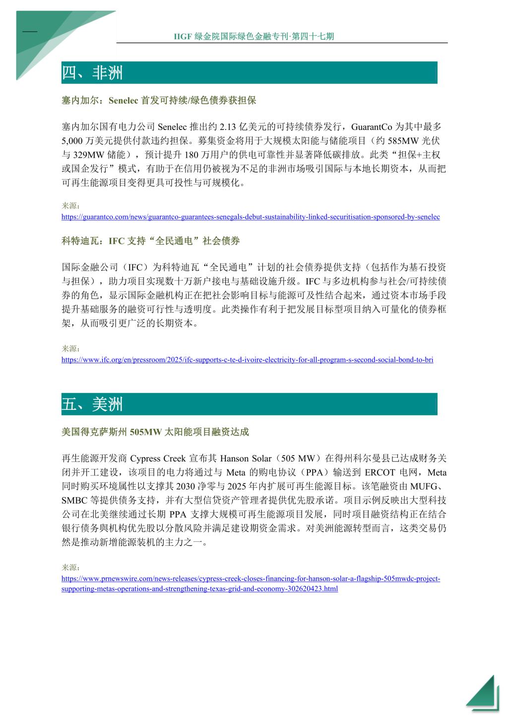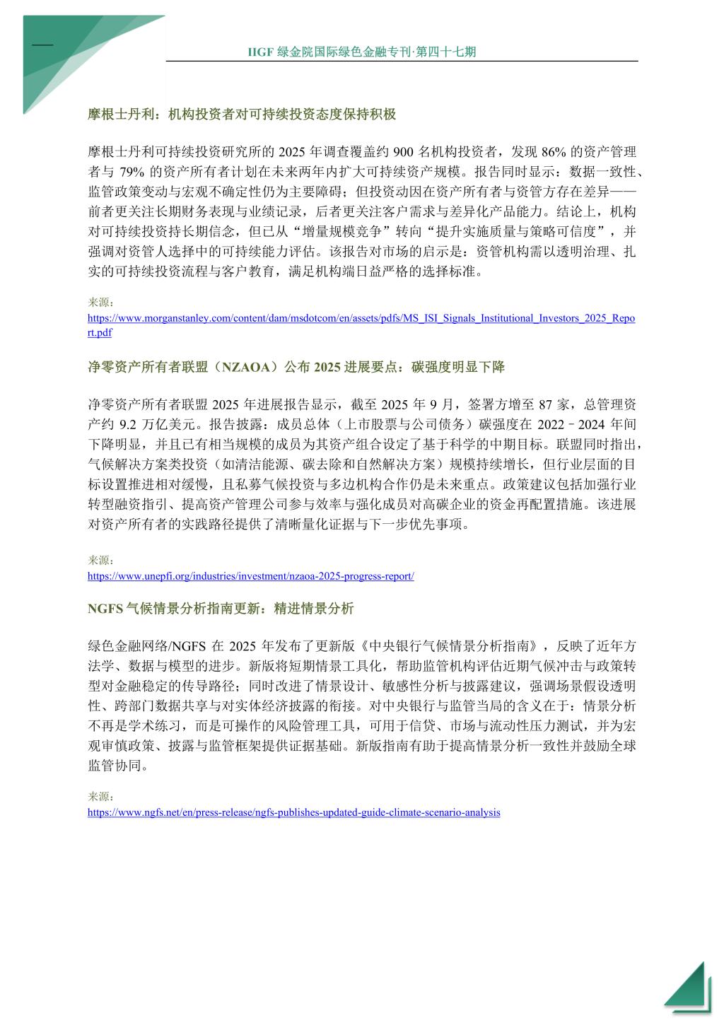 本期国际绿色金融专刊将为您介绍2025年12月全球绿色金融领域的最新发展和动态。世界经济论坛报告显示,全球影响力投资网络研究指出资产所有者愈加关注影响力投资效果,CDP称全球转型融资仍存在规模与配置缺口,摩根士丹利调查显示机构投资者对可持续投资态度保持积极,NGFS气候情景分析指南更新。在亚洲,印度尼西亚加入新开发银行并注资,Just Climate为印度与土地转型注资3.75亿美元;在欧洲,欧盟监察员称欧盟委员会在“Omnibus”过程中存在程序瑕疵,EIB 发布“Green Checker”金融工具,伦敦证券交易所集团研究显示资产所有者可持续投资行动显著加速,法国农业信贷提出 90/10 绿色/棕色融资比率目标;在非洲,塞内加尔国有电力公司Senelec首发可持续/绿色债券获担保,IFC支持科特迪瓦“全民通电”社会债;在北美洲,美国得克萨斯州 505MW 太阳能项目融资达成。