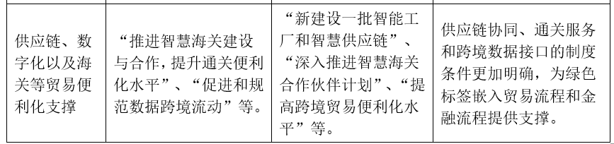 从2025年到2026年,政府工作报告中与跨境绿色贸易相关的政策表述进一步拓展,相关支持方向也更加清晰。2025年的相关内容重点集中在绿色要素识别、碳核算、标准认证和绿色贸易壁垒应对等方面。报告提出培育绿色贸易、数字贸易等新增长点,支持有条件的地方发展新型离岸贸易,积极发展边境贸易;同时,在推进碳达峰碳中和过程中,提出开展碳排放统计核算,建立产品碳足迹管理体系和碳标识认证制度,积极应对绿色贸易壁垒。 从这些表述看,2025年的政策重点主要在于提升绿色识别、核算和规则应对能力,为绿色要求进入跨境贸易活动提供基础条件。2026年的表述则在此基础上进一步拓展。报告在对外开放部分提出拓展中间品贸易,发展数字贸易、绿色贸易,积极扩大进口,推进贸易平衡发展,提高跨境贸易便利化水平;同时提出引导企业优化全球市场布局,推进贸易投资一体化、内外贸一体化发展,并进一步强调引导产业链供应链合理有序跨境布局,完善海外综合服务体系,加强对外投资风险防控和海外利益保护。
