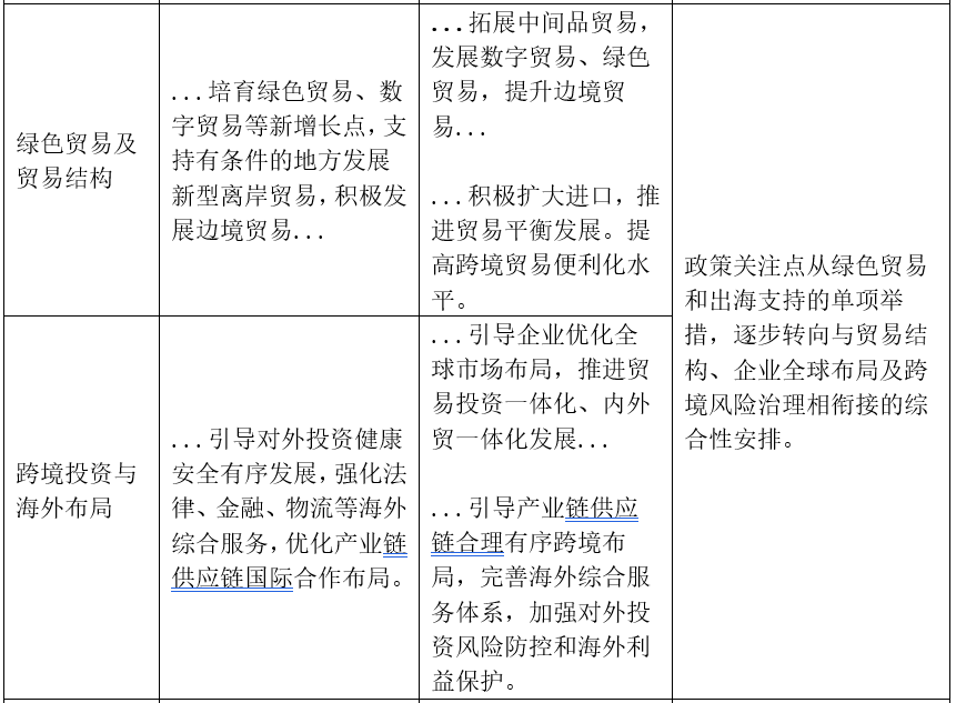 与2025年相比,2026年的表述更明显地将绿色贸易放入贸易结构优化、跨境便利化、企业全球布局和海外风险治理的整体语境之中。这种变化尚不足以说明一套完整的跨境绿色贸易政策框架已经在政府工作报告中被明确写出,但已经为观察绿色要求如何进一步进入贸易流转、企业出海和相关金融支持提供了更丰富的政策接口。为更直观呈现两年政府工作报告中绿色贸易相关表述的变化,本文梳理了报告中与绿色贸易相关维度的文本便于对比: