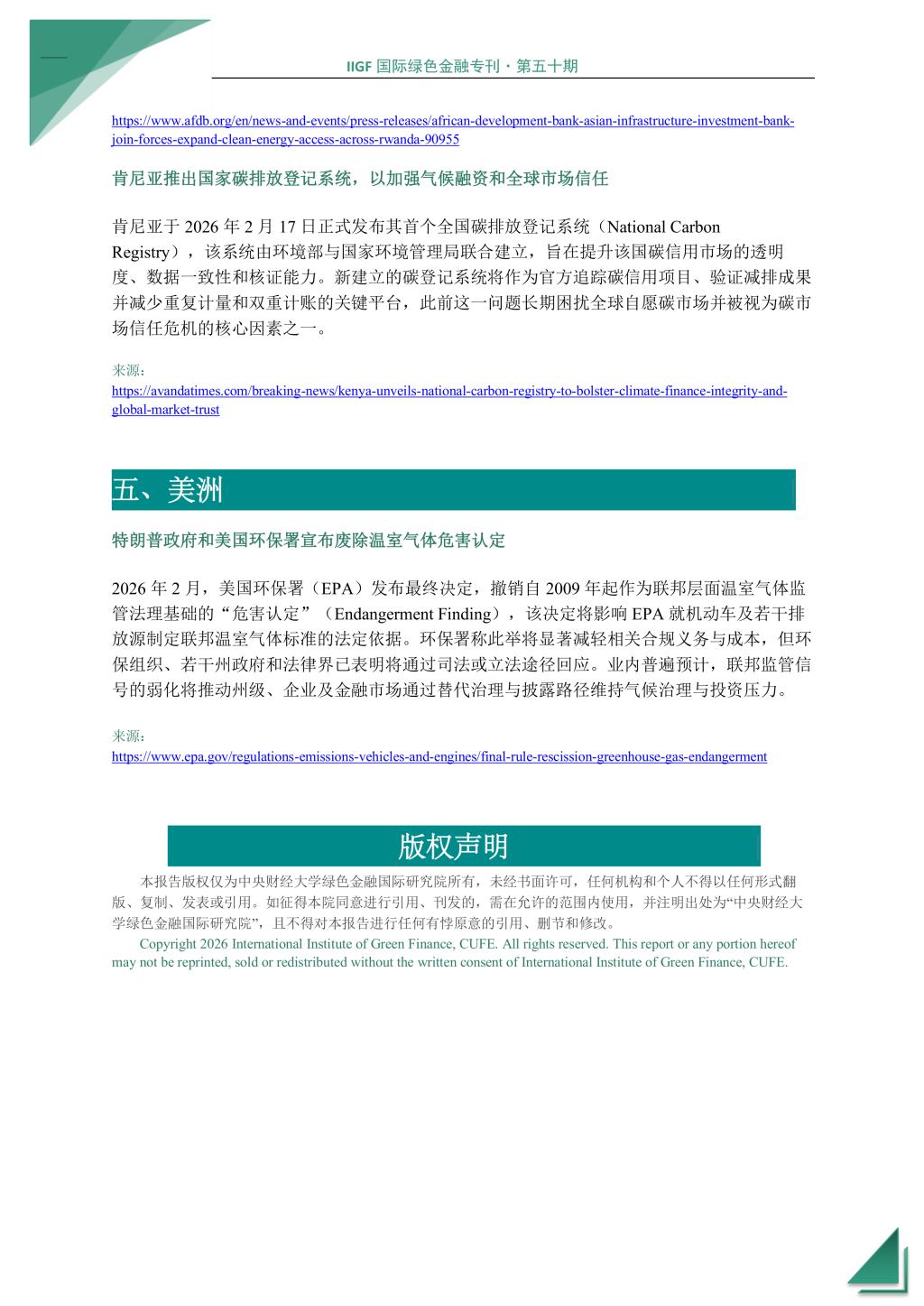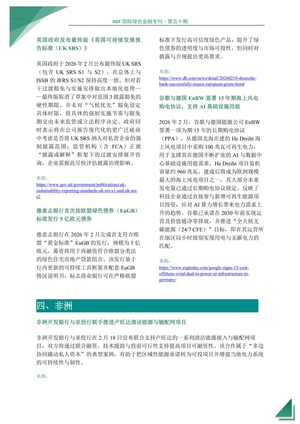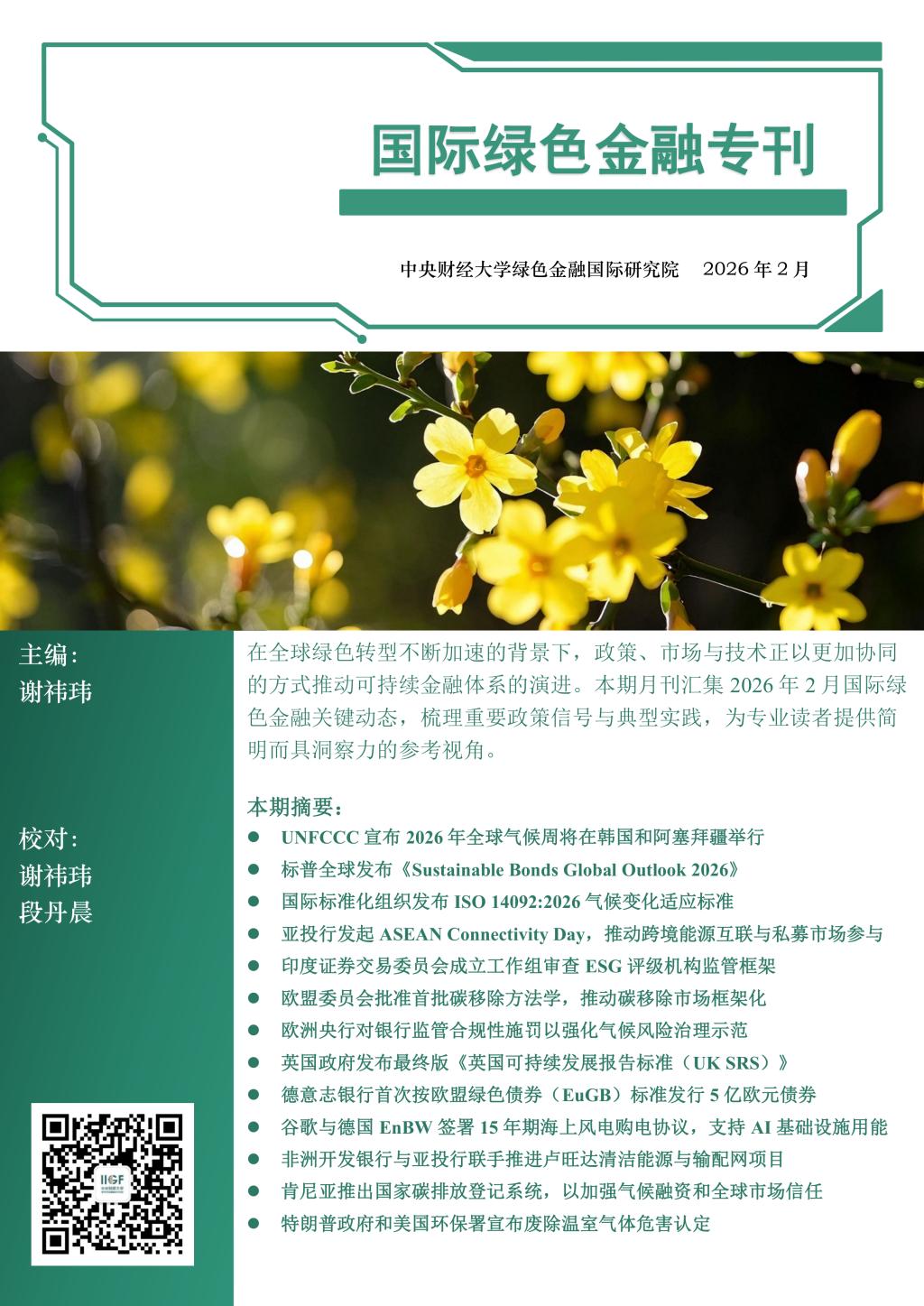 本期国际绿色金融专刊将为您介绍2026年2月全球绿色金融领域的最新发展和动态。UNFCCC宣布 2026 年全球气候周将在韩国和阿塞拜疆举行,标普全球发布《Sustainable Bonds Global Outlook 2026》,国际标准化组织发布 ISO 14092:2026气候变化适应标准。在亚洲,亚投行发起 ASEAN Connectivity Day,印度证券交易委员会成立工作组审查ESG评级机构监管框架;在欧洲,欧盟委员会批准首批碳移除方法学,欧洲央行对银行监管合规性施罚以强化气候风险治理示范,英国政府发布最终版《英国可持续发展报告标准(UK SRS)》,德意志银行首次按欧盟绿色债券(EuGB)标准发行 5 亿欧元债券,谷歌与德国EnBW 签署 15 年期海上风电购电协议;在非洲,非洲开发银行与亚投行联手推进卢旺达清洁能源与输配网项目,肯尼亚推出国家碳排放登记系统;在美洲,特朗普政府和美国环保署宣布废除温室气体危害认定。