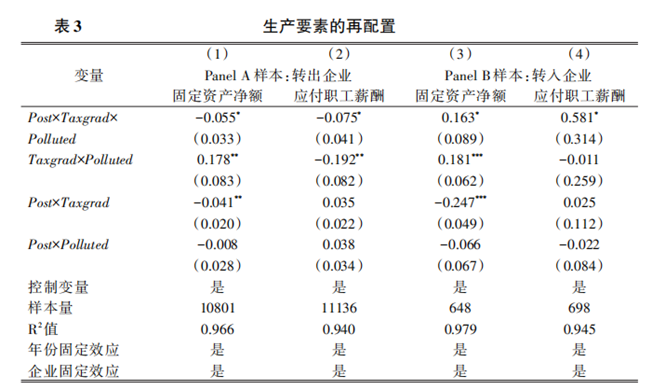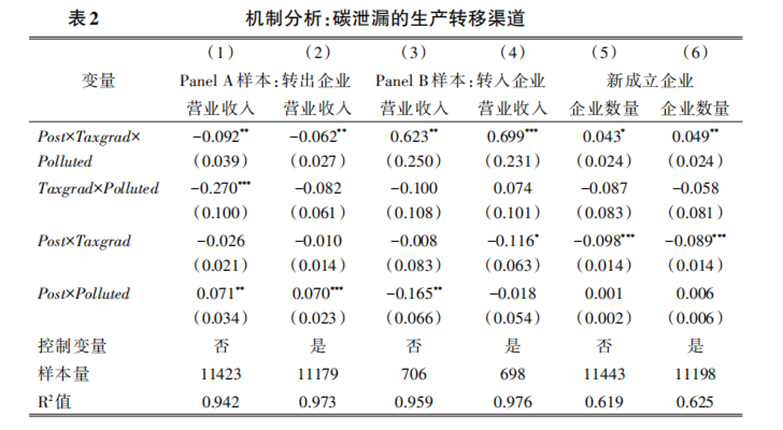 为进一步验证生产转移是资本与劳动要素投入的同步转移,而非财务层面的调整,本文进一步考察了企业固定资产净额和应付职工薪酬的变化。表3列(1)和列(2)的补充回归结果为此提供了证据。在PanelA样本中,核心解释变量Post×Taxgrad×Polluted的系数均在统计上显著为负。这表明,在环保税政策实施后,面临更高税负压力的污染型企业,其有形生产要素投入,包括关键的生产设备和用工规模,均出现了收缩。与此同时,列(3)和列(4)的结果显示,在PanelB样本中核心解释变量的系数显著为正,说明这些位于低税率地区的关联企业,其固定资产和应付职工薪酬同时在显著增加。这一“此消彼长”的现象清晰地表明,本文所发现的生产转移并非简单的规模收缩或技术改进效应,而是包含了固定资产和劳动力等核心生产要素在地理空间上的再配置。这一发现为生产转移是碳泄漏关键渠道的机制(假说2)提供了有效证据。