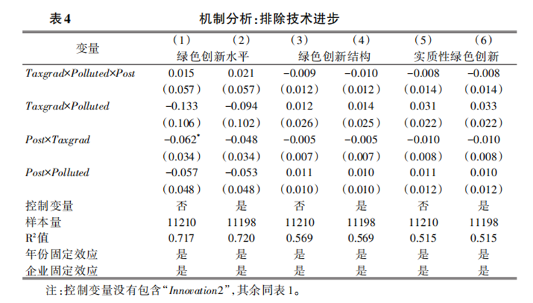 正如理论分析部分所言,大量文献分析了环保税如何推动企业的环保技术进步。若本文观测到的投资方企业碳排放减少主要源于技术升级而非生产转移,则碳泄漏的逻辑便难以成立。因此,本文进一步讨论环保技术进步在投资方企业碳排放减少过程中的作用。绿色创新水平是评估企业积极响应绿色转型和实现可持续发展的关键指标。首先,本文具体使用企业绿色专利数量加1取对数来表示企业的绿色创新水平,将其作为被解释变量的回归结果如表4的列(1)、列(2)所示。Post×Taxgrad×Polluted的系数均不显著,这表明,在环保税实施后,转出企业的绿色创新水平相对于非转出企业没有显著提升,排除了绿色创新导致的转出企业碳排放减少。其次,本文用绿色专利占总专利的比例表示企业的绿色创新结构,回归结果如表4的列(3)、列(4)所示。最后,本文进一步采用绿色发明专利在总绿色专利中的比例来衡量企业的实质性绿色创新,回归结果如表4的列(5)、列(6)所示。表4列(3)~(6)的Post×Taxgrad×Polluted系数均不显著,说明转出企业的绿色创新结构和实质性绿色创新都没有显著提高,意味着转出企业并没有通过提升技术应对环保税的冲击。可见,转出企业碳排放的减少并非源于技术进步。