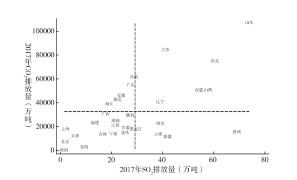 图1各省份二氧化碳与二氧化硫排放的分布图
