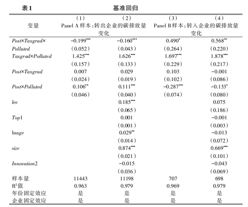 Postt×Taxgradi×Pollutedj是式(1)的核心解释变量,其系数β1衡量了在环保税实施后,拥有转移渠道的污染企业相对于其他企业的碳排放量差异。在PanelA样本中,预期β1显著为负,表示转出企业碳排放减少;而在PanelB样本中,预期β1显著为正,表示转入企业碳排放增加。这两个对称性的结果将共同为本文的碳泄漏假说提供关键证据。此外,Xit表示企业层面的控制变量,表示时间固定效应,表示企业个体固定效应,表示随机误差项。