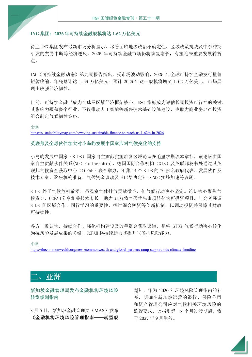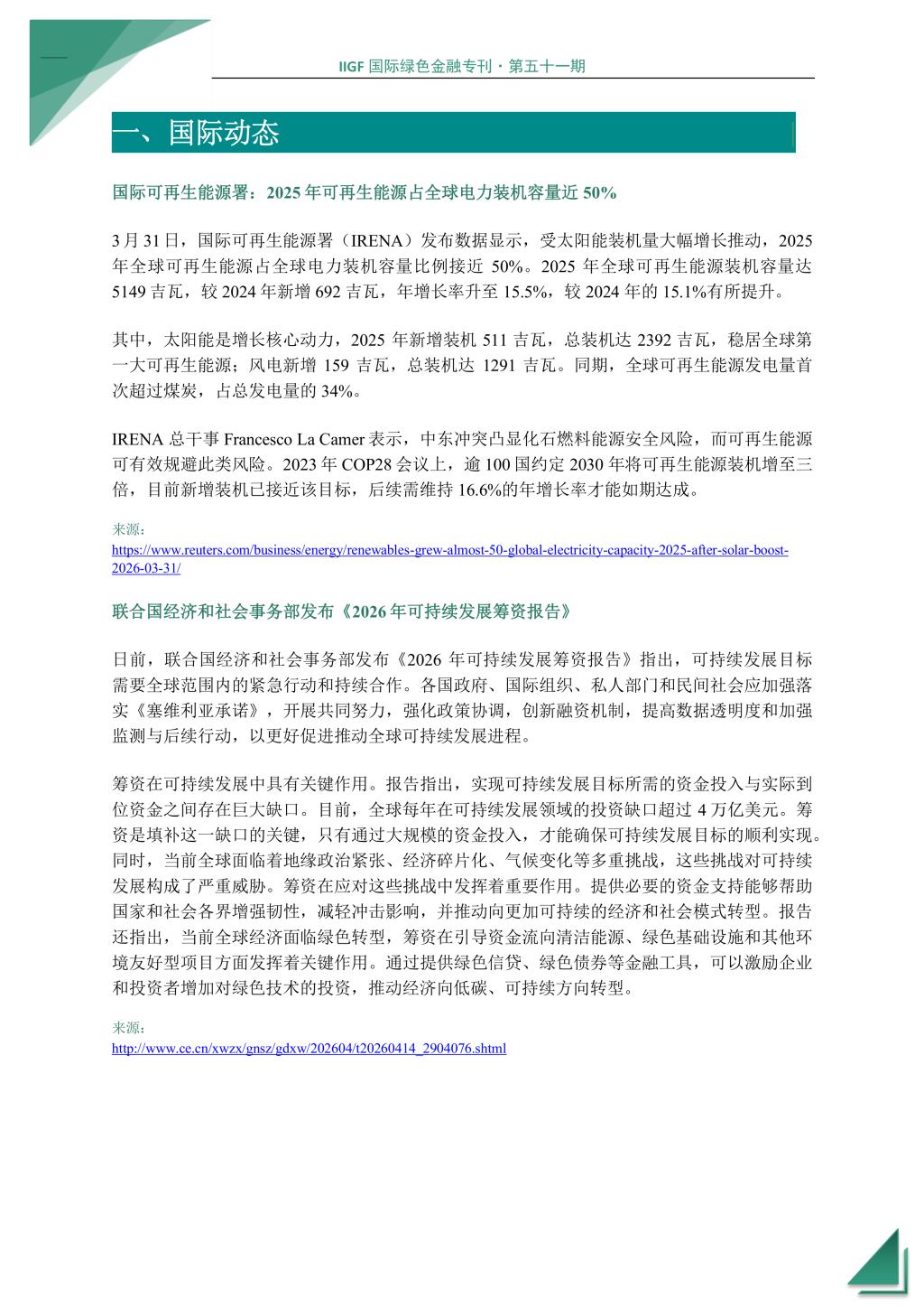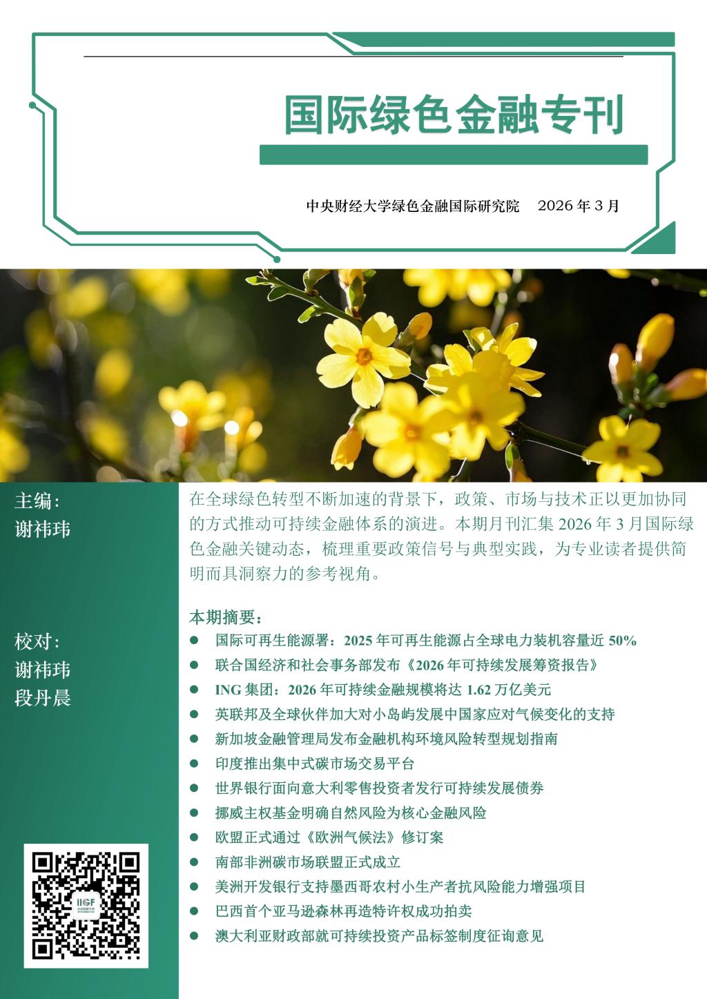 本期国际绿色金融专刊将为您介绍2026年3月全球绿色金融领域的最新发展和动态。国际可再生能源署发布数据显示2025 年可再生能源占全球电力装机容量近50%,联合国经济和社会事务部发布《2026年可持续发展筹资报告》,ING集团研究指出2026年可持续金融规模将达1.62万亿美元,英联邦及全球伙伴加大对小岛屿发展中国家应对气候变化的支持。在亚洲,新加坡金融管理局发布金融机构环境风险转型规划指南,印度推出集中式碳市场交易平台;在欧洲,世界银行面向意大利零售投资者发行可持续发展债券,挪威主权基金明确自然风险为核心金融风险,欧盟正式通过《欧洲气候法》修订案;在非洲,南部非洲碳市场联盟正式成立;在美洲,美洲开发银行支持墨西哥农村小生产者抗风险能力增强项目,巴西首个亚马逊森林再造特许权成功拍卖;在大洋洲,澳大利亚财政部就可持续投资产品标签制度征询意见。