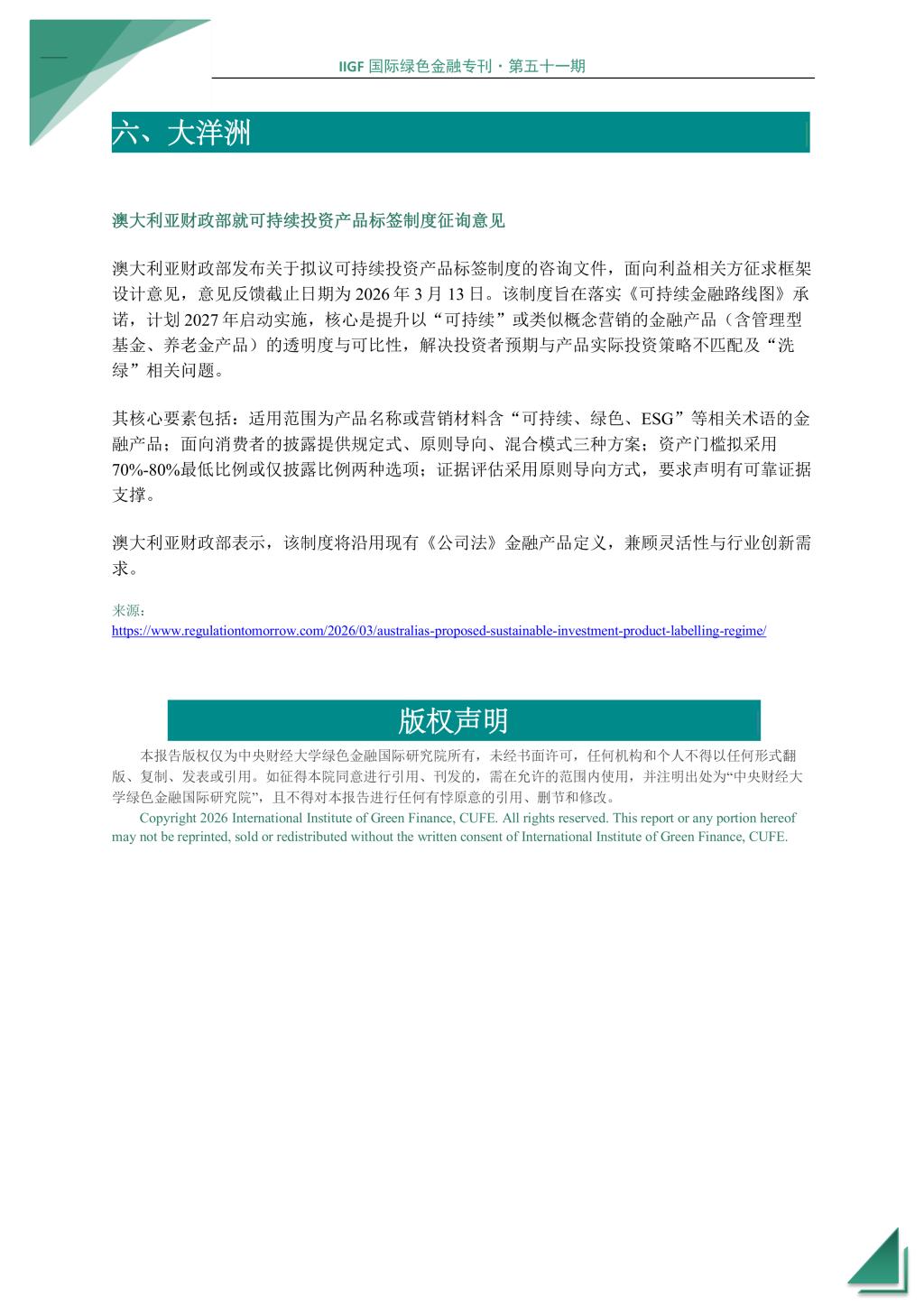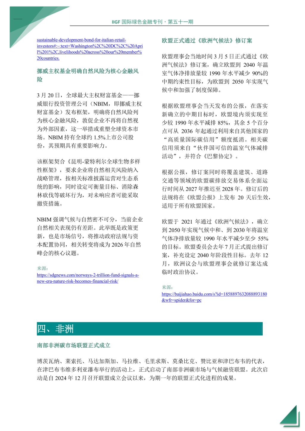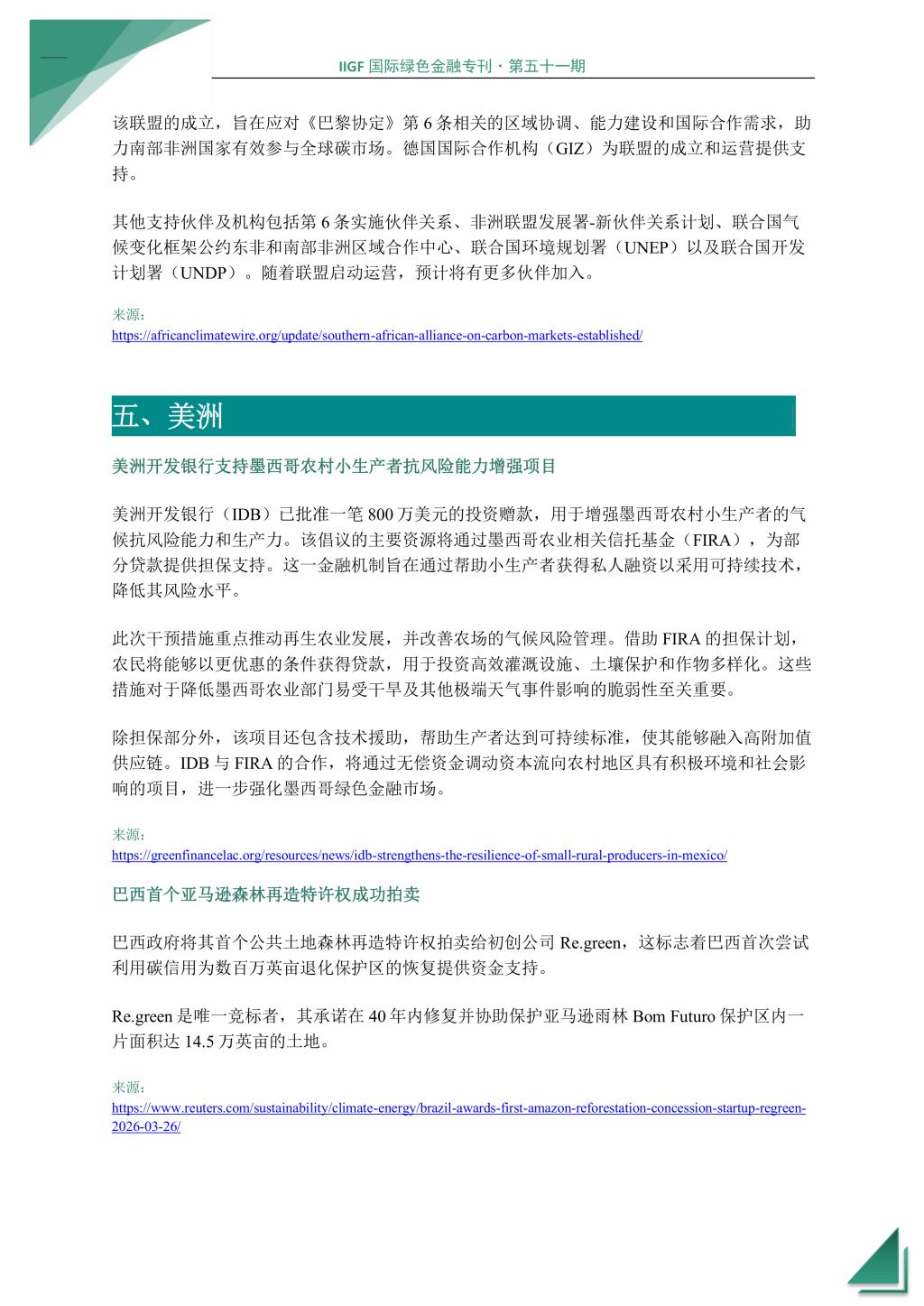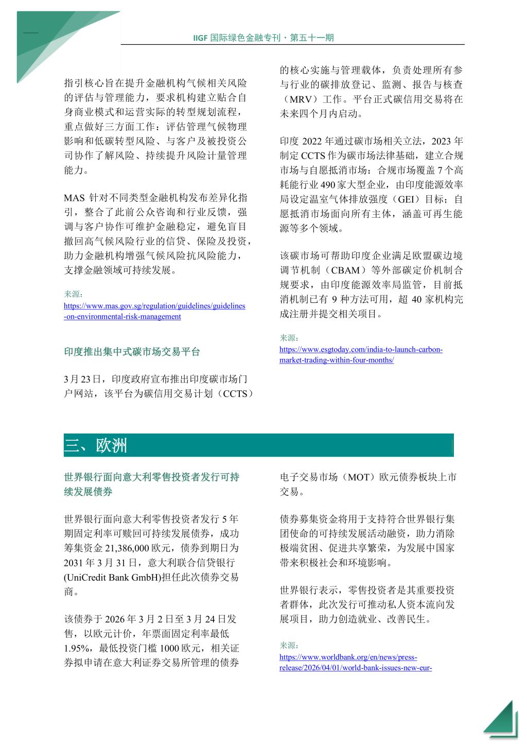 本期国际绿色金融专刊将为您介绍2026年3月全球绿色金融领域的最新发展和动态。国际可再生能源署发布数据显示2025 年可再生能源占全球电力装机容量近50%,联合国经济和社会事务部发布《2026年可持续发展筹资报告》,ING集团研究指出2026年可持续金融规模将达1.62万亿美元,英联邦及全球伙伴加大对小岛屿发展中国家应对气候变化的支持。在亚洲,新加坡金融管理局发布金融机构环境风险转型规划指南,印度推出集中式碳市场交易平台;在欧洲,世界银行面向意大利零售投资者发行可持续发展债券,挪威主权基金明确自然风险为核心金融风险,欧盟正式通过《欧洲气候法》修订案;在非洲,南部非洲碳市场联盟正式成立;在美洲,美洲开发银行支持墨西哥农村小生产者抗风险能力增强项目,巴西首个亚马逊森林再造特许权成功拍卖;在大洋洲,澳大利亚财政部就可持续投资产品标签制度征询意见。