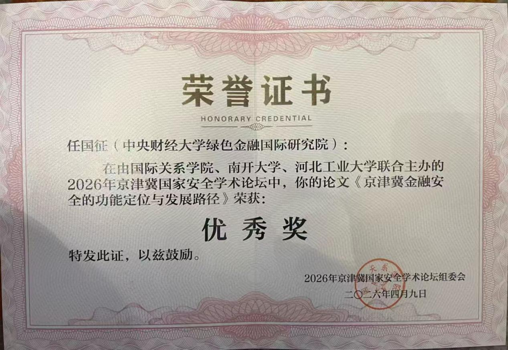 4月8日至10日,由国际关系学院、南开大学和河北工业大学联合主办的2026年京津冀国家安全学术论坛在京举行。国际关系学院院长胡继平、南开大学校长助理李月琳、河北工业大学党委副书记赵斌、广东财经大学党委书记郑贤操等高校、研究机构的专家学者齐聚一堂,紧扣“‘十五五’时期国家安全学发展的新担当”主题,共谋国家安全学科建设与发展。论坛设置了主旨报告、平行分论坛及优秀论文颁奖等环节。本次会议开展了学术征文,共收到投稿论文近300篇,经专家委员会严格评审,最终评选出获奖论文。中央财经大学绿色金融国际研究院健康金融实验室主任任国征提交的论文《京津冀金融安全的功能定位与发展路径》荣获优秀奖。