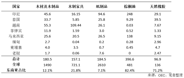 另一与林业高度相关的产品为纸浆和纸制品(海关编码HS 47、48),印尼、越南、泰国、马来西亚均为纸浆和纸制品出口大国,印尼出口额达到94亿美元,泰国、越南、马来西亚出口额均超过25亿美元。但东南亚纸浆与纸制品出口额仅占全球约7%,又因纸浆和纸制品供应链与其他林产品差异较大,本文不对其进行深入讨论。