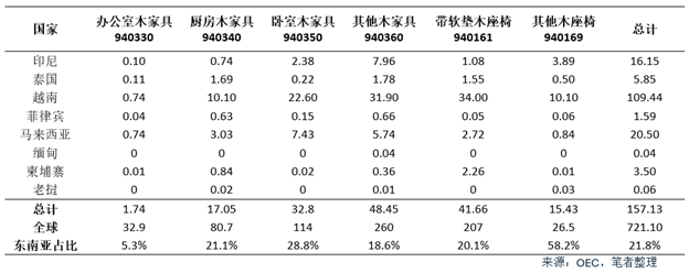 表1. 2023年东南亚各国各类别木制家具出口额(单位:亿美元)