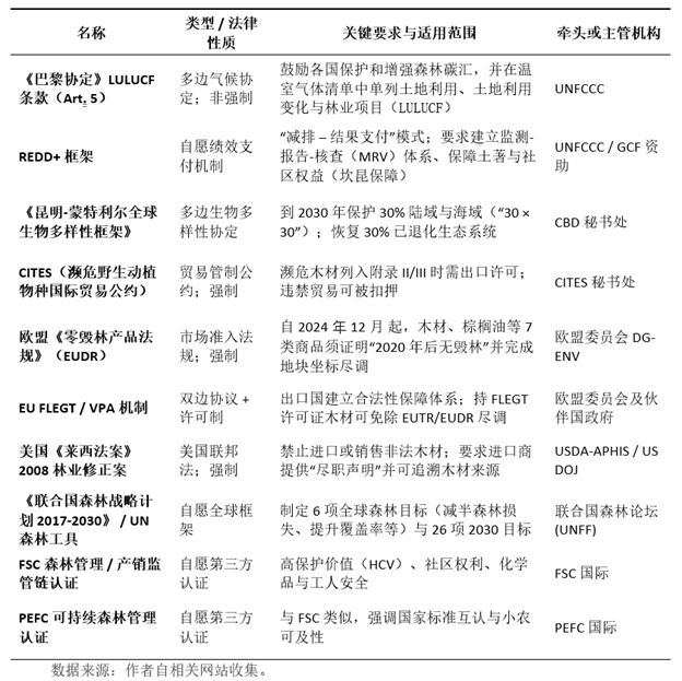 过去十年,东南亚各国将各项国际机制[7]纳入国家战略。这些国际机制指导下的国家战略实施,显著提升了合法木材贸易与供应链透明度,并为碳市场与生物多样性目标提供了制度支撑;同时,对区域产业链提出更高合规挑战,推动林业治理向生态保护、民生与减排协同转型,为东南亚可持续林业发展奠定了长效机制。表2提供了相关机制和框架的大致信息。