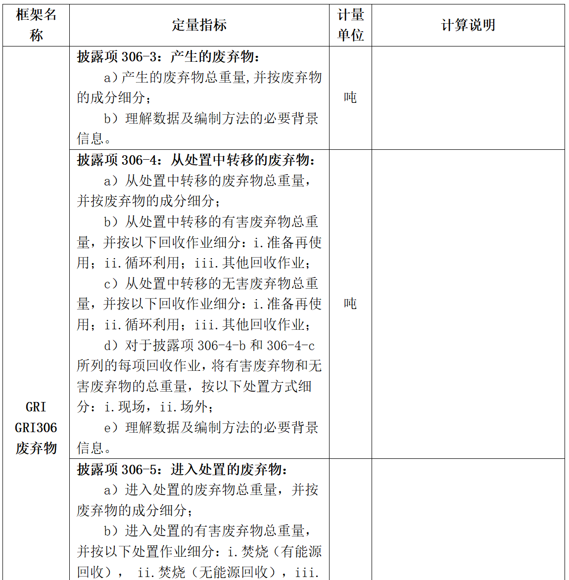 表1 国内外披露框架中“废弃物处置与管理”相关定量指标