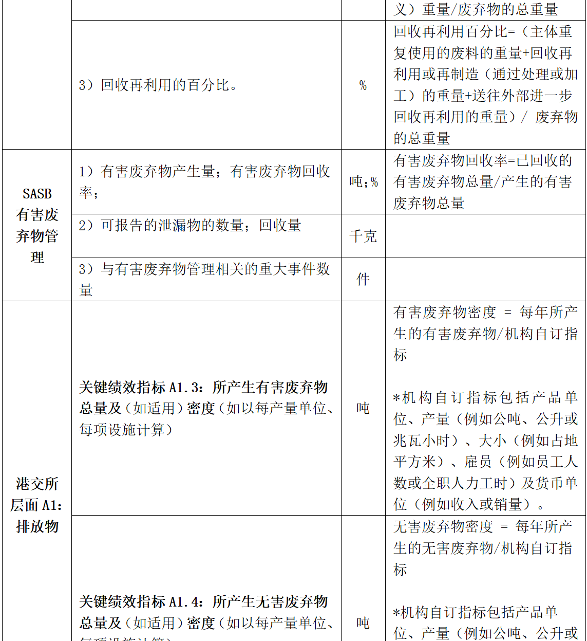 目前,如GRI、SASB、ISSB等国际框架,以及港交所《ESG守则》中均对企业的废弃物处置与管理设置了相关定量指标。GRI标准对企业废弃物产生情况设计了全面框架,包括按废弃物类别、处置方法等进行细分披露,以完整反映废弃物的去向与管理情况。港交所《ESG守则》强制要求企业对无害和有害废弃物的绝对总量进行披露;同时鼓励企业披露密度(强度)指标,以帮助比较不同企业之间的废弃物管理水平,但对于密度指标的计算方法,港交所并未提供统一指标,而是允许企业自行选择。ISSB和SASB的指标更具有行业针对性,不同行业在废弃物管理层面所要求的披露指标可能存在不同,例如针对医疗保健相关行业,其废弃物管理的指标会更细化到针对焚烧、回收利用、填埋等不同处理方式上;除了关注废弃物的产生情况,ISSB和SASB也同时关注废弃物回收利用的效率。国内三大交易所虽然提出了企业ESG信息披露应涵盖废弃物的回收及综合利用的情况,但并未明确设置披露指标,目前仍以定性描述为主。