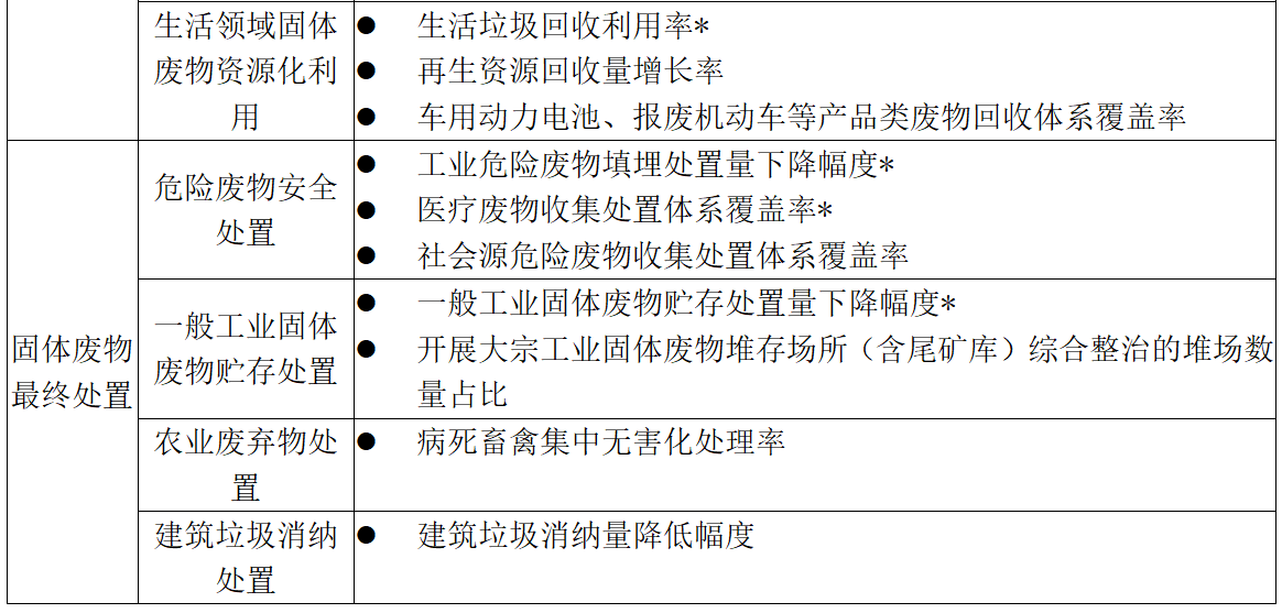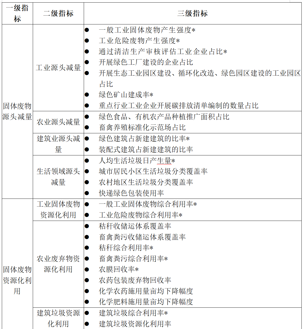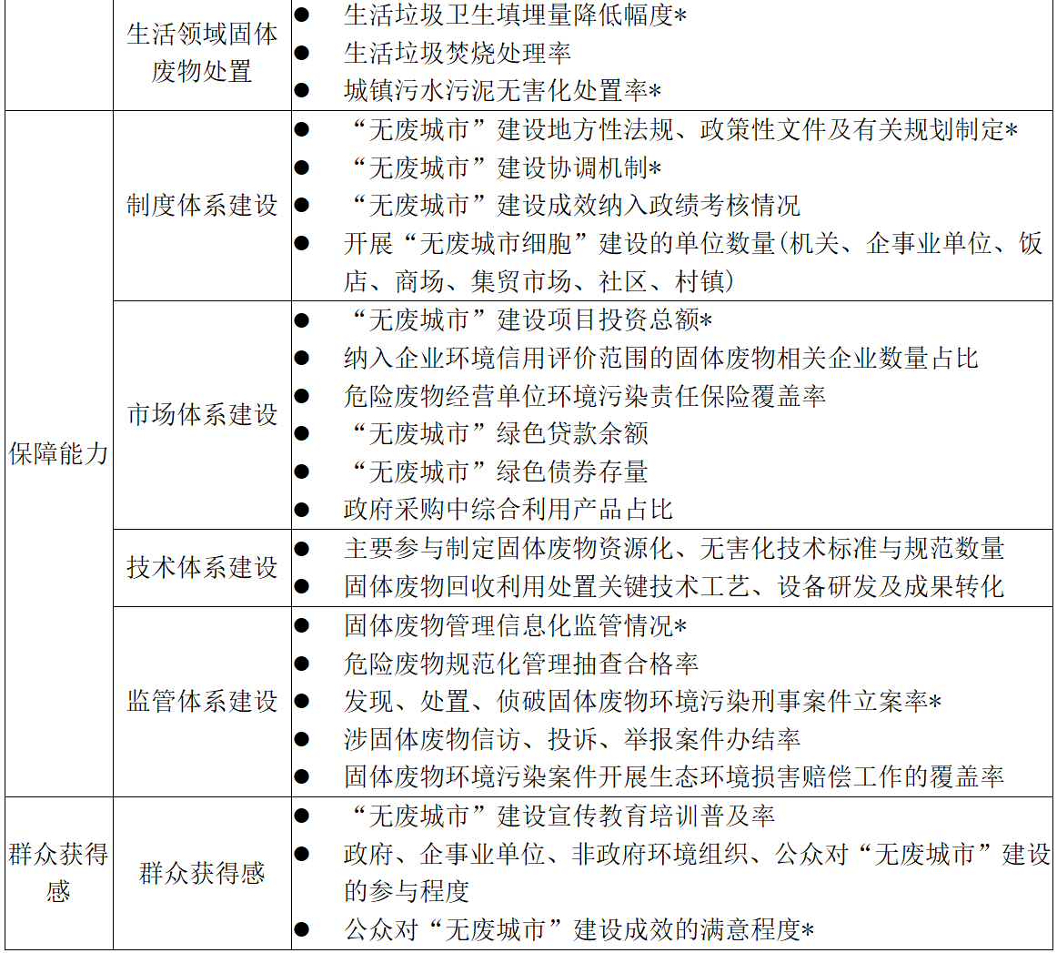 《“无废城市”建设指标体系(2021年版)》[1]由固体废物源头减量、固体废物资源化利用、固体废物最终处置、保障能力、群众获得感5个一级指标、18个二级指标和60个三级指标(其中24项标*的为约束性指标,36项可选指标)组成。