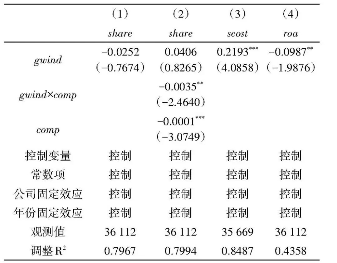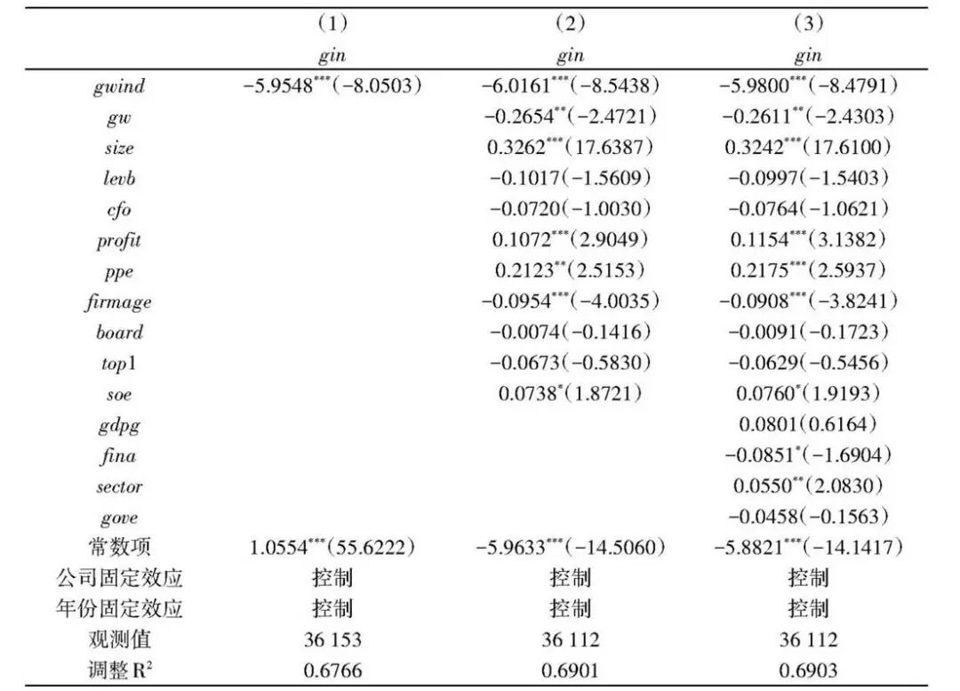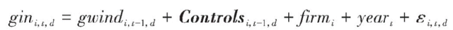其中,gini,t,d代表绿色创新数量,为核心被解释变量;gwindi,t-1,d代表同行业其他企业的“漂绿”平均水平;Controlsi,t-1,d代表所有控制变量;firmi为公司固定效应,yeart为年份固定效应;εi,t,d为随机干扰项。本文的所有回归都将标准误聚类至公司层面。