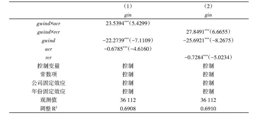 2.替换解释变量。其一,本文将上市公司当年申请并在当年及其后两年获取授权的绿色专利数量加1取对数得到第一个替代变量gin1;其二,将上市公司当年申请并在当年及其后三年获取授权的绿色专利数量加1取对数得到第二个替代变量gin2。