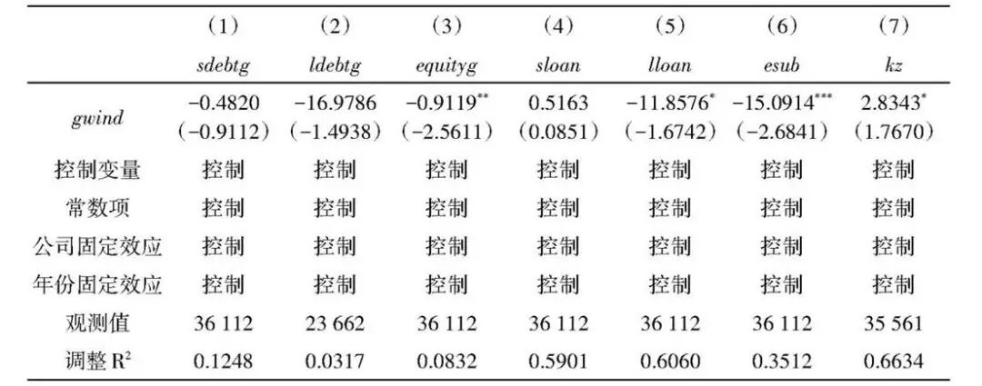 基于以上分析,本文首先以短期债务增长率(sdebtg)衡量上市公司当期短期债务融资能力;以长期负债增长率(ldebtg)衡量上市公司当期长期债务融资能力;以股权融资能力(equityg)衡量上市公司当期通过常规权益融资渠道获取注资的能力。其次,本文分别以上市公司短期、长期银行借款加1取对数衡量上市公司获取的短期、长期银行借款规模(sloan、lloan),以财务报表附注中的政府环保补助总额加1取对数衡量上市公司获取的环保补助规模(esub)。最后以kz指数衡量融资约束水平。结果表明,同行漂绿程度对上市公司短期、长期债务融资能力(sdebtg、ldebtg)存在负面影响但不显著。同行漂绿显著削弱了上市公司的股权融资能力(equityg),并减少了其获取的长期借款(lloan)、环保补贴(esub)规模,增强了其总体融资约束(kz)。