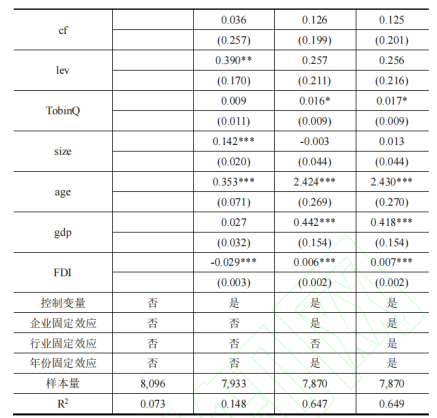 控制变量包括企业层面的现金流、杠杆率、托宾Q值、规模、年龄,以及地区层面的GDP与FDI。所有连续变量均进行1%—99%的缩尾处理以消除极端值影响。