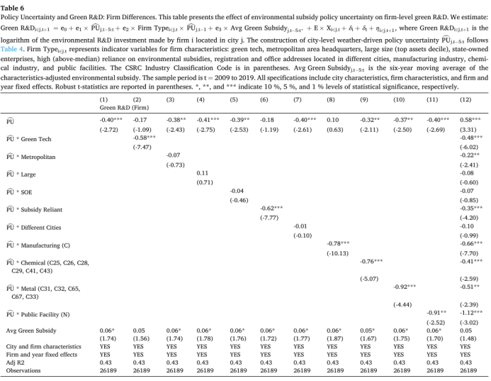 进一步的分析显示,补贴不确定性的负面影响在不同企业之间具有明显的异质性。对环境补贴依赖程度较高的企业、环境技术导向较强的企业以及面临较大财务压力的企业,对补贴不确定性的反应更为敏感。这一发现与本文的理论分析一致:对于那些原本需要通过补贴弥补市场失灵、以支持高风险、不可逆绿色研发活动的企业而言,补贴不确定性会显著加剧其投资决策中的风险权衡,从而放大“观望效应”,抑制绿色创新投入。因此,政策不确定性并非对所有企业均匀作用,而是集中影响了政策原本意在重点扶持的企业群体,从而在一定程度上削弱了环境补贴政策的整体效果。