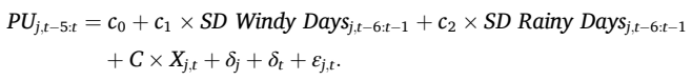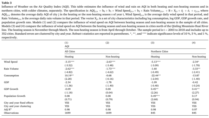 其中因变量为城市j第t年季节s(供暖季或非供暖季)的日均AQI,核心自变量为同期日均风速与降雨量,控制变量Xj,t含城市特征(消费、GDP、GDP增长率、人口增长率),同时加入城市与年份固定效应,标准误聚类于城市与年份;考虑到北方城市供暖季(11月至次年3月)燃煤对污染的影响,还单独对秦岭-淮河以北城市进行检验,非供暖季为4月至10月,样本覆盖2003-2018年352个城市。