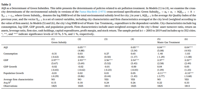 为了进一步确认这一关系,研究还考察了另一个政府主导的环境项目——城市级工业废气治理支出。表2模型五和模型六的结果显示,当以工业废气治理支出作为因变量时,空气质量指数同样表现出显著的正向影响。
