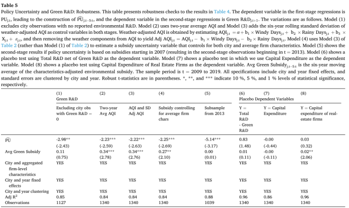 表5展示了稳健性检验结果,其中第一列样本排除了绿色研发为零的城市观测,第二列采用两年平均AQI重新计算,第三列控制天气调整后的AQI波动性,第四列使用更严格的补贴调整方法,第五列限制样本为2013年后数据。此外,表5第六列将因变量替换为非绿色研发支出,第七列和第八列分别检验对固定资产投资和房地产企业投资的影响。所有稳健性检验均证实,天气驱动的政策不确定性对绿色研发的负向效应具有特异性,不影响其他类型投资,支持了因果识别的有效性。