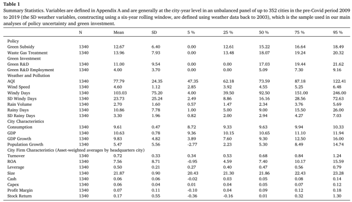 表1展示了主要变量的描述性统计结果。该表涵盖了政策变量、绿色投资变量、天气与污染变量、城市特征以及城市企业特征资产加权平均值等多个板块。所有变量基本都在城市-年度层面定义,在2009年至2019年新冠疫情前的不平衡面板中最多涵盖352个城市,该样本也是政策不确定性与绿色投资主要分析所使用的样本。用于构建天气波动变量的标准差指标使用了可回溯至2003年的天气数据进行计算。表中列出了每个变量的观测值数量、均值、标准差以及第5、第25、第50、第75和第95百分位数的数值,全面呈现了样本数据的分布特征。