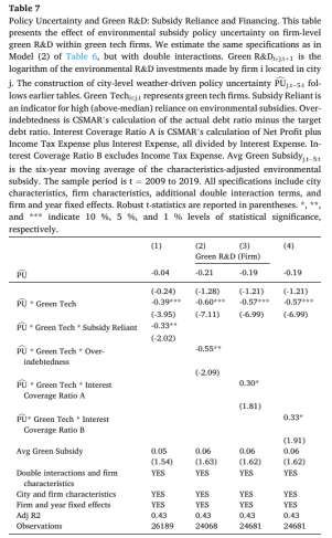 表7展示了绿色技术企业子样本中财务约束的调节作用,引入了过度负债和利息覆盖率与政策不确定性的三重交互项,结果显示财务压力加剧了政策不确定性对绿色技术企业研发的抑制作用。