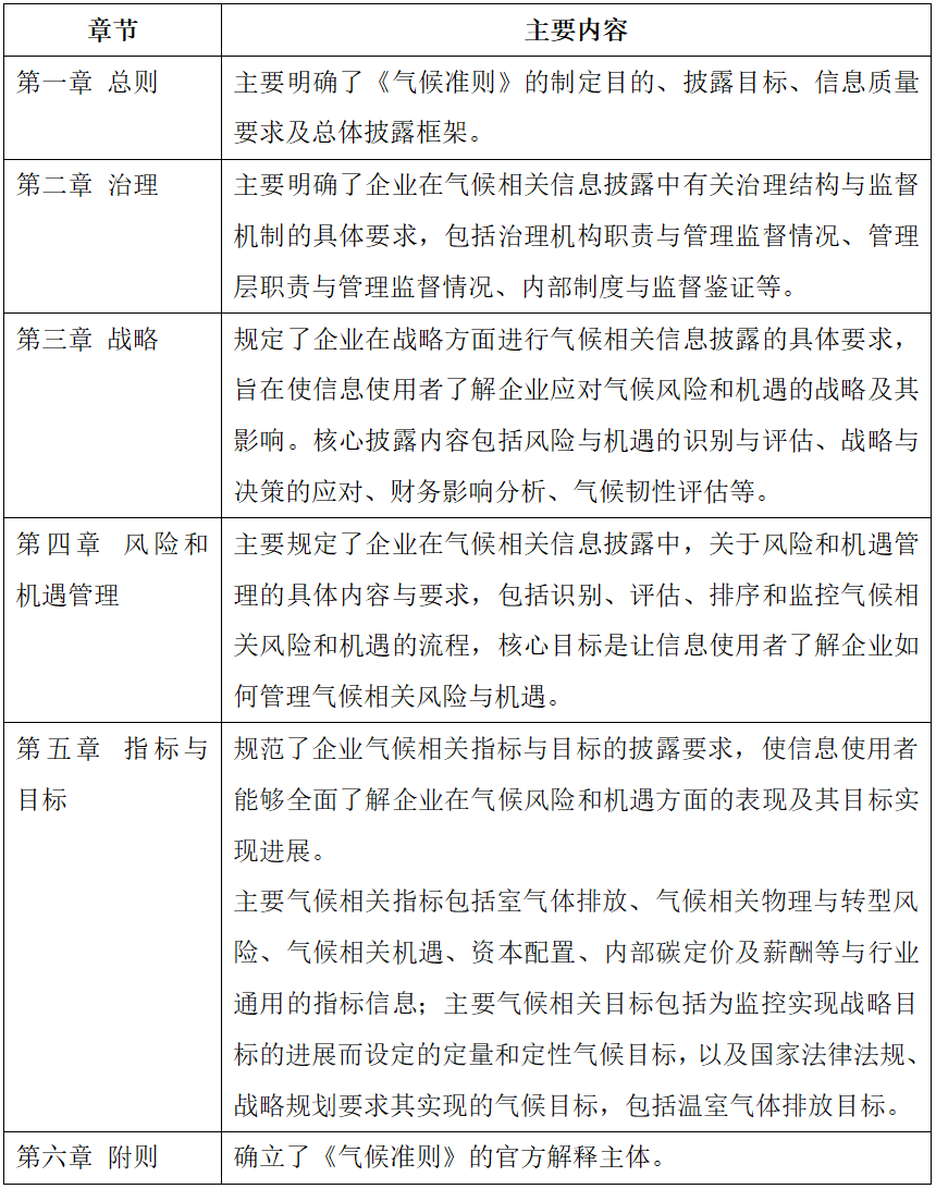 《气候准则》主要分为六个章节,涵盖总则、治理、战略、风险和机遇管理、指标和目标、附则。