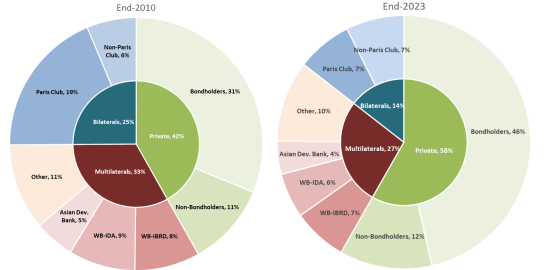 过去十年间,中低收入国家公共和公共担保(PPG)外债结构发生显著变化。私营部门与非巴黎俱乐部债权人的风险敞口持续扩大。自2010年至2023年底,商业债权人和非巴黎俱乐部官方债权人持有的公共外债占比从48%跃升至65%,增幅35%;同期巴黎俱乐部债权人份额大幅缩减,多边债权人份额小幅下降(图1)。尽管融资结构向私营债权人和非巴黎俱乐部债权人的整体转变拓宽了融资渠道,但也带来了更沉重且成本更高的偿债负担。