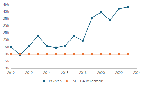 近年来,巴基斯坦外部债务压力持续上升,已成为制约其宏观经济稳定和中长期发展的关键因素。根据世界银行国际债务统计数据,截至2023年末,巴基斯坦外债年度偿付额占出口收入的比重已高达43%,显著高于国际货币基金组织债务可持续性分析中通常采用的10%警戒线(下图)。这一指标不仅反映出巴基斯坦外汇收入对偿债支出的高度依赖,也意味着其在外部冲击下的宏观脆弱性显著上升。