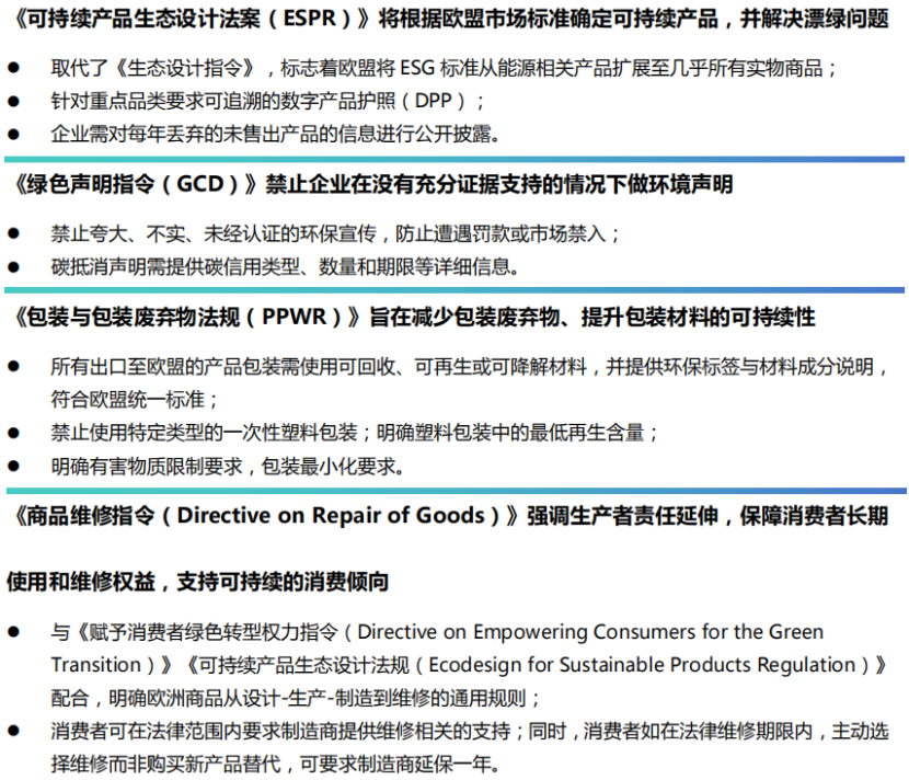相较于将可持续发展压力集中于部分头部企业,欧盟将可持续发展管理要求解构并转移至更具体的全面市场法案,传递出“净零排放不是绿色发展竞赛,而是具体的可持续发展成果”的信号。通过出台环境维度的可持续产品设计需求、包材可持续、绿色营销、产品使用寿命等,社会维度的强迫劳动、消费者商品维修权保护,以及治理维度的网络安全、通用数据保护等相关法案和条例,从局限于欧盟境内企业的可持续发展要求,通过绿色贸易政策外溢效应可提升全球可持续发展更为具体的举措。