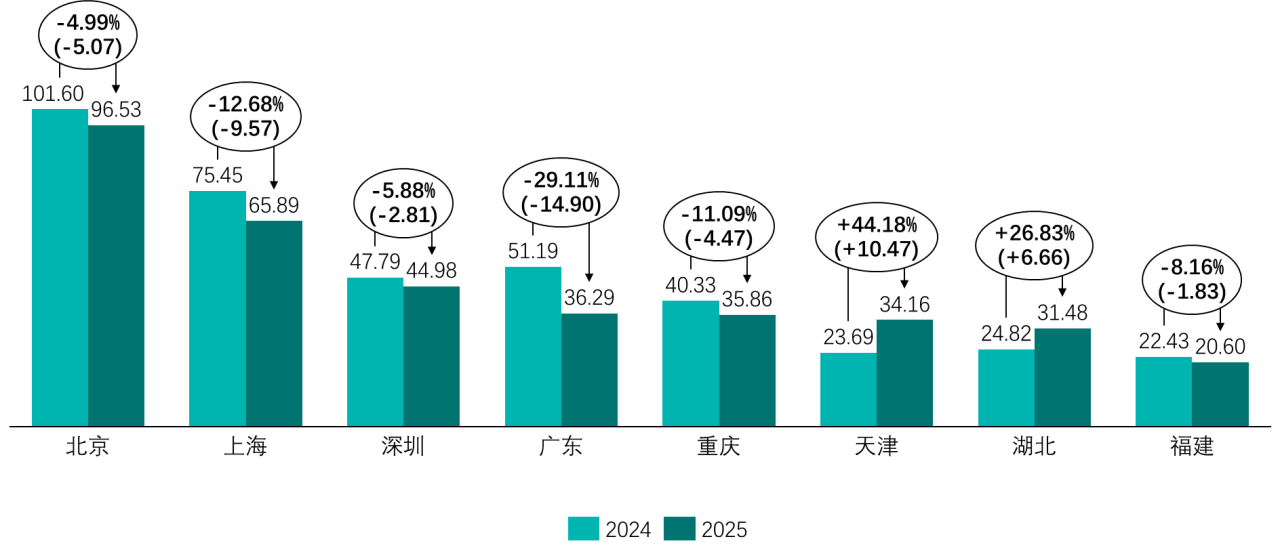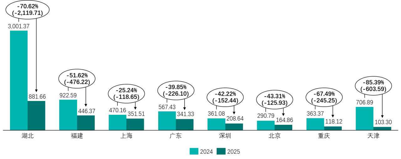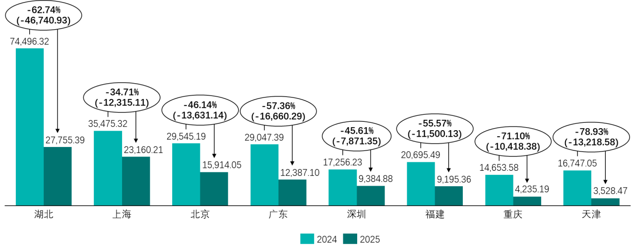 成交额方面,2025年八个试点合计成交额为10.56亿元,较2024年的23.79亿元减少13.23亿元,同比下降55.61%。由于价格对成交额形成一定支撑,因此成交额降幅小于成交量降幅。