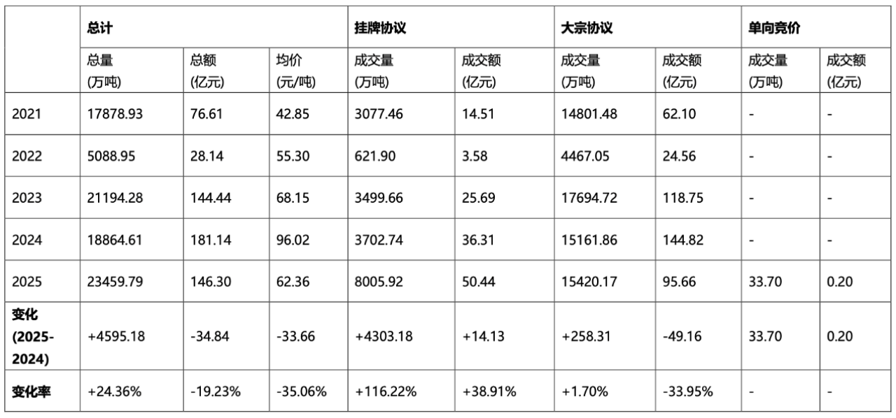 在大宗协议方面,2025年成交量为较2024年的1.52亿吨仅增加258.31万吨,同比增长1.70%,继续承担市场主体的大体量交易需求;但其成交量占比由2024年的80.37%下降至65.73%,全年成交增量主要并非主要来自大宗协议增加。在挂牌协议成交方面,2025年成交量由2024年的3702.74万吨增至8005.92万吨,同比大幅增长116.22%,成交量占比由19.63%提升至34.13%,成为带动全年成交量增长的主要来源。挂牌协议成交量的大幅增加反映出市场撮合成交更活跃,且交易更倾向于通过公开挂牌方式实现。在单向竞价方面,该交易方式于2025年7月16日达成首笔交易,全年共有5个交易日,共计成交33.70万吨,整体呈现低频、点状分布特征。其中,10万吨及以上的成交出现在3个交易日,分别为7月16日、10月30日和11月4日;其余两个交易日分别为8月28日的0.50万吨和9月5日的0.20万吨,属于小规模成交。
