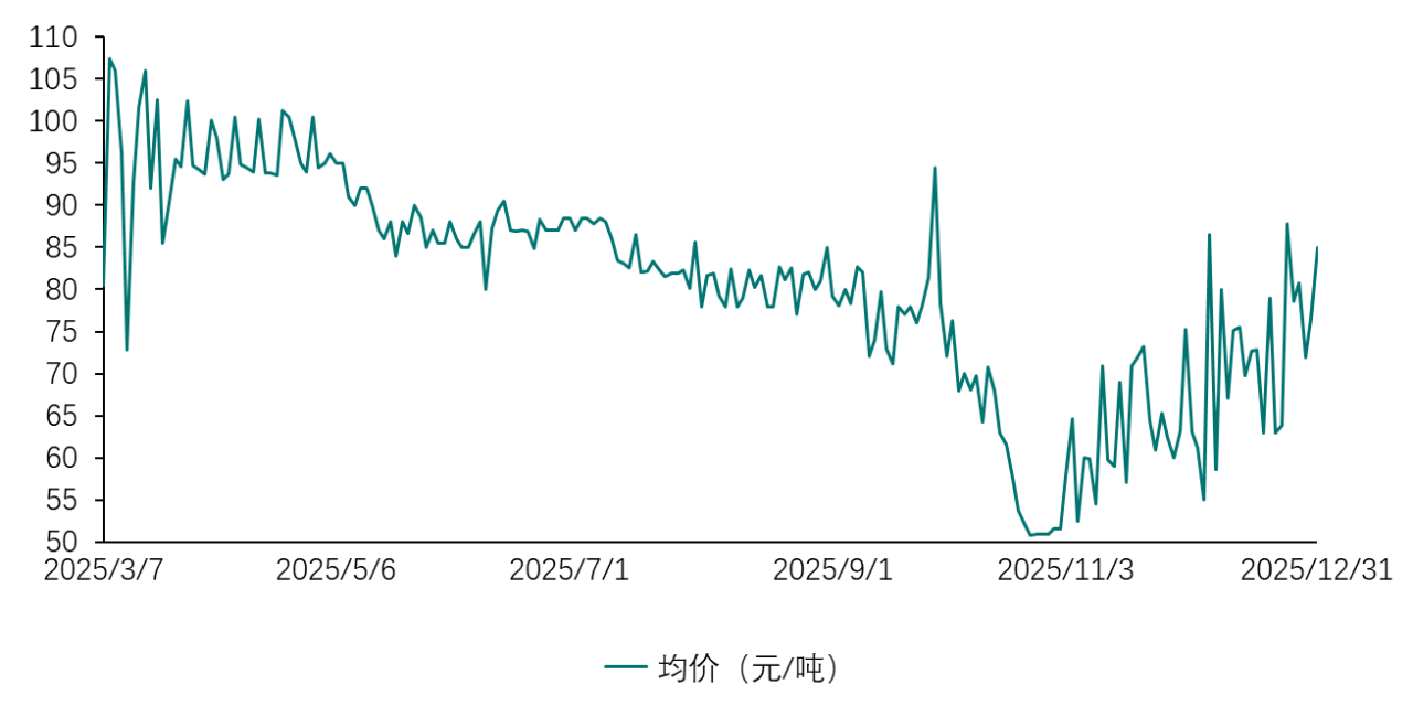价格走势方面,2025年,CCER成交均价为70.76元/吨,较2024年63.51元/吨上升11.42%[5]。其中,并网光热发电项目成交均价为81.58元/吨,并网海上风电项目成交均价为69.27元/吨。从年内走势看,在重启初期CCER价格一度偏高,3月10日最高达107.36元/吨。随后,随着市场交易逐步平稳、履约需求尚未集中释放、以及全国碳市场配额(CEA)价格走低带动履约成本预期下移,CCER价格逐步走弱,于10月24日触及全年低点50.84元/吨。11、12月,重点排放单位集中采购CCER用于履约抵销,需求快速升温;与此同时,可用CCER供给增长相对缓慢,阶段性供需偏紧带动价格回升。12月24日成交均价升至87.85元/吨,较10月低点回升72.80%。总体上,CCER价格走势与CEA大体一致,上半年偏弱,临近清缴阶段回升。