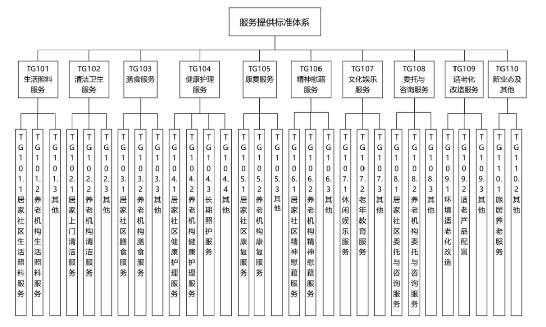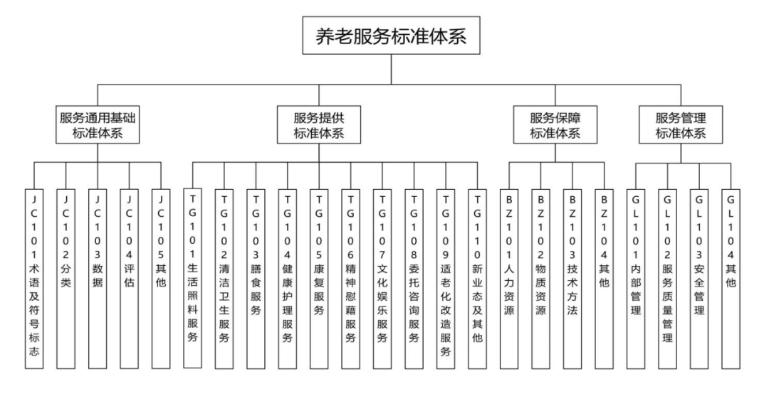 一是服务通用基础标准体系。主要用于统一养老服务领域基础性、通用性概念和范围。