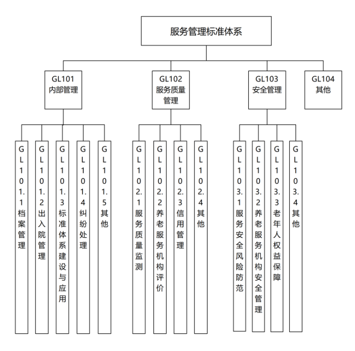 四是服务管理标准体系。主要用于规范各类养老服务机构出入院、标准体系建设、纠纷处理、服务质量监测、服务机构评价、信用管理、服务安全风险防范、老年人权益保障等方面内容。
