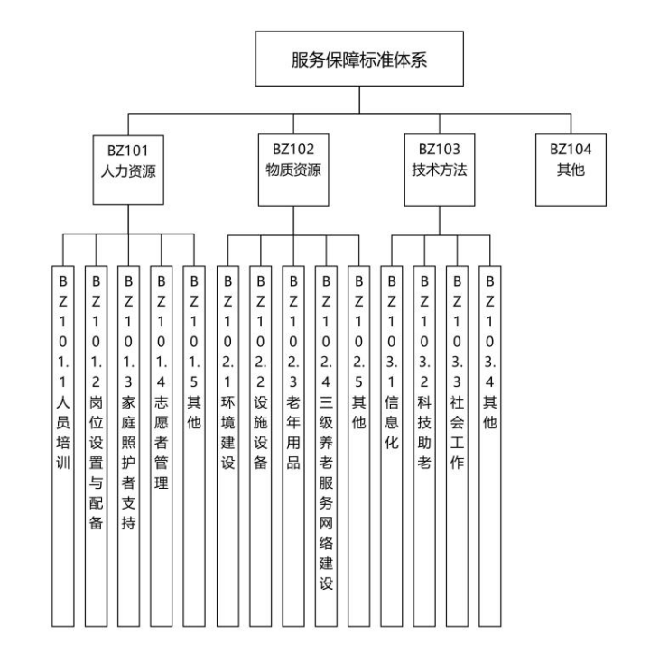 三是服务保障标准体系。主要用于规范支撑各类养老服务机构运行的人员培训、岗位设置与配备、环境建设、设施设备、科技助老、信息化、老年用品等保障要素。