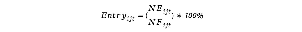 被解释变量Y表示i市j行业在t年的企业进入率(Entry)或退出率(Exit)。当j=0时,模型估计采用年份—地市数据;当j∈{1,2,…,13}时,模型估计采用年份—地市—行业数据。借鉴毛其淋和盛斌(2013)的做法,将企业进入率Entryijt