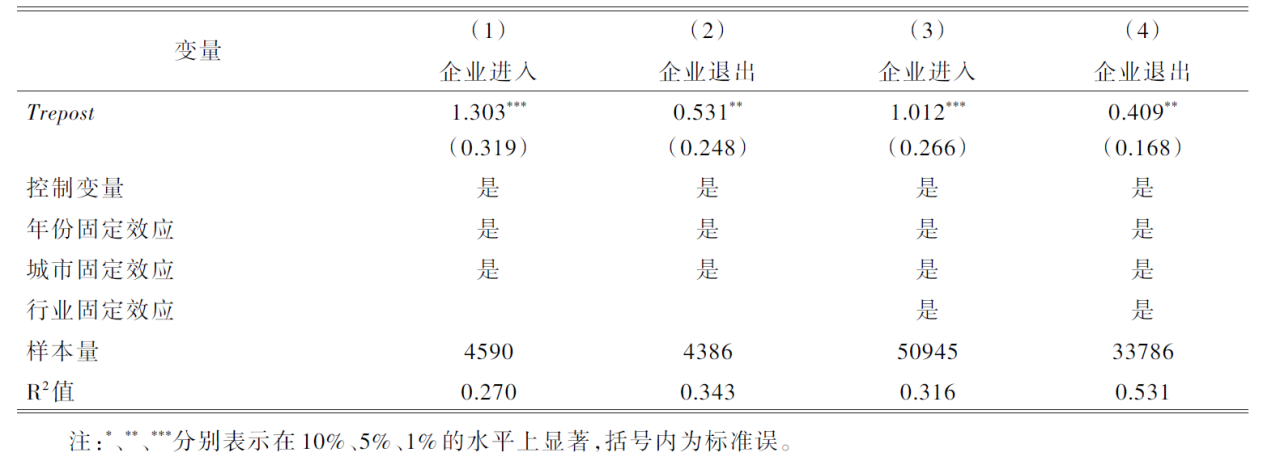 其中,NE为企业进入数量,定义为i市j行业t年新成立的企业数量。NX为i市j行业在t年退出的企业数量。NF为企业总数,i市j行业在1949~t年成立,且在t年底仍然在业或存续的企业数量。核心解释变量Trepost为i城市在t年是否实施了试点政策的虚拟变量。参考宋弘等(2019)的做法,将三批低碳城市试点政策的起始时间分别确定为2011年、2013年和2017年。当一个城市有多个政策实施时间时,按照实施最早时间进行界定。